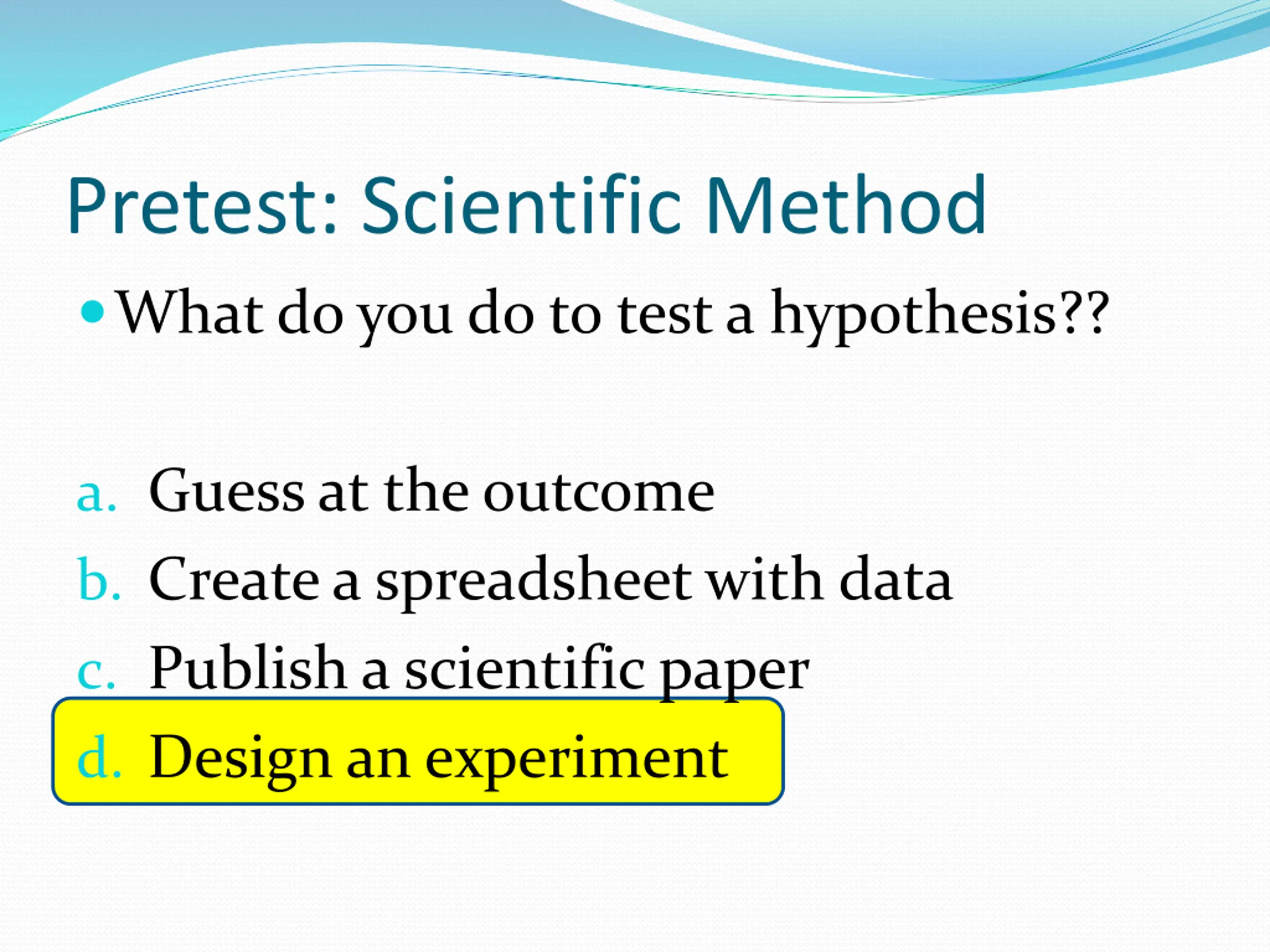 Pretest: Scientific Method What do you do to test a hypothesis?? a. Guess at the outcome b. Create a spreadsheet with data c. Publish a scientific paper d. Design an experiment