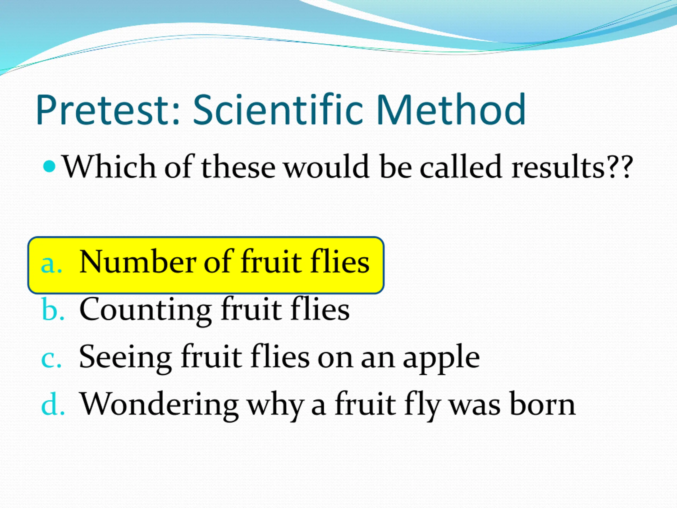 Pretest: Scientific Method Which of these would be called results?? a. Number of fruit flies b. Counting fruit flies c. Seeing fruit flies on an apple d. Wondering why a fruit fly was born