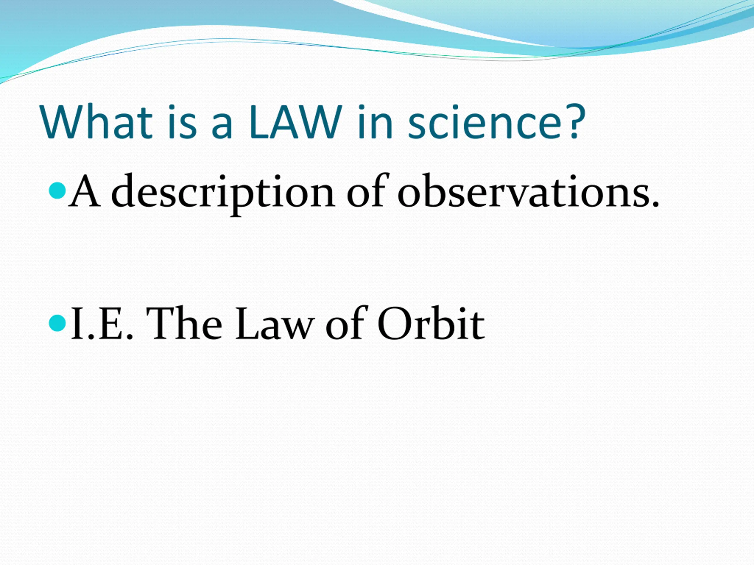 What is a LAW in science? A description of observations. I.E. The Law of Orbit