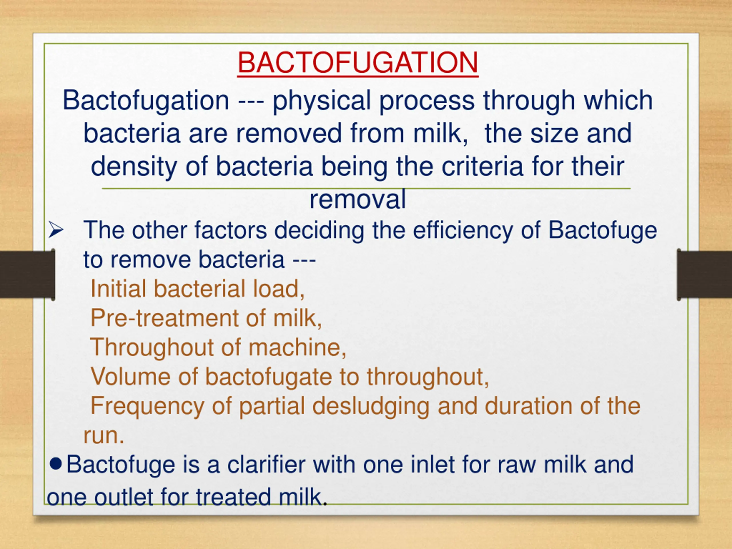BACTOFUGATION Bactofugation --- physical process through which bacteria are removed from milk, the size and density of bacteria being the criteria for their removal The other factors deciding the efficiency of Bactofuge to remove bacteria --- Initial bacterial load, Pre-treatment of milk, Throughout of machine, Volume of bactofugate to throughout, Frequency of partial desludging and duration of the run. lBactofuge is a clarifier with one inlet for raw milk and one outlet for treated milk.
