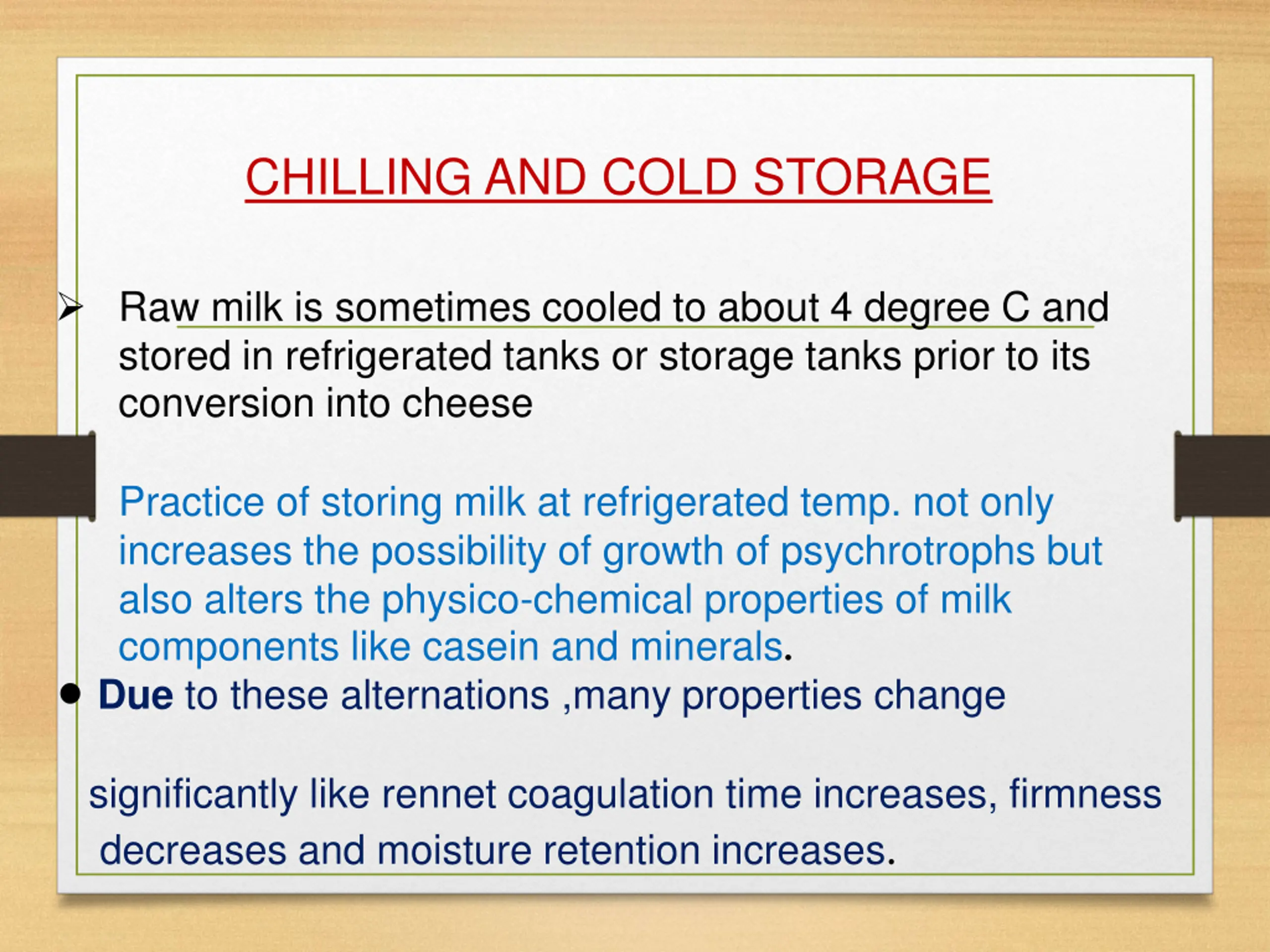 CHILLING AND COLD STORAGE Raw milk is sometimes cooled to about 4 degree C and stored in refrigerated tanks or storage tanks prior to its conversion into cheese Practice of storing milk at refrigerated temp. not only increases the possibility of growth of psychrotrophs but also alters the physico-chemical properties of milk components like casein and minerals. l Due to these alternations ,many properties change significantly like rennet coagulation time increases, firmness decreases and moisture retention increases.