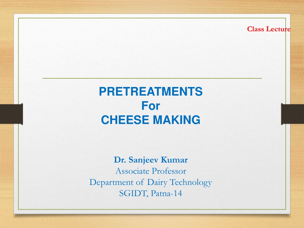 Class Lecture PRETREATMENTS For CHEESE MAKING Dr. Sanjeev Kumar Associate Professor Department of Dairy Technology SGIDT, Patna-14