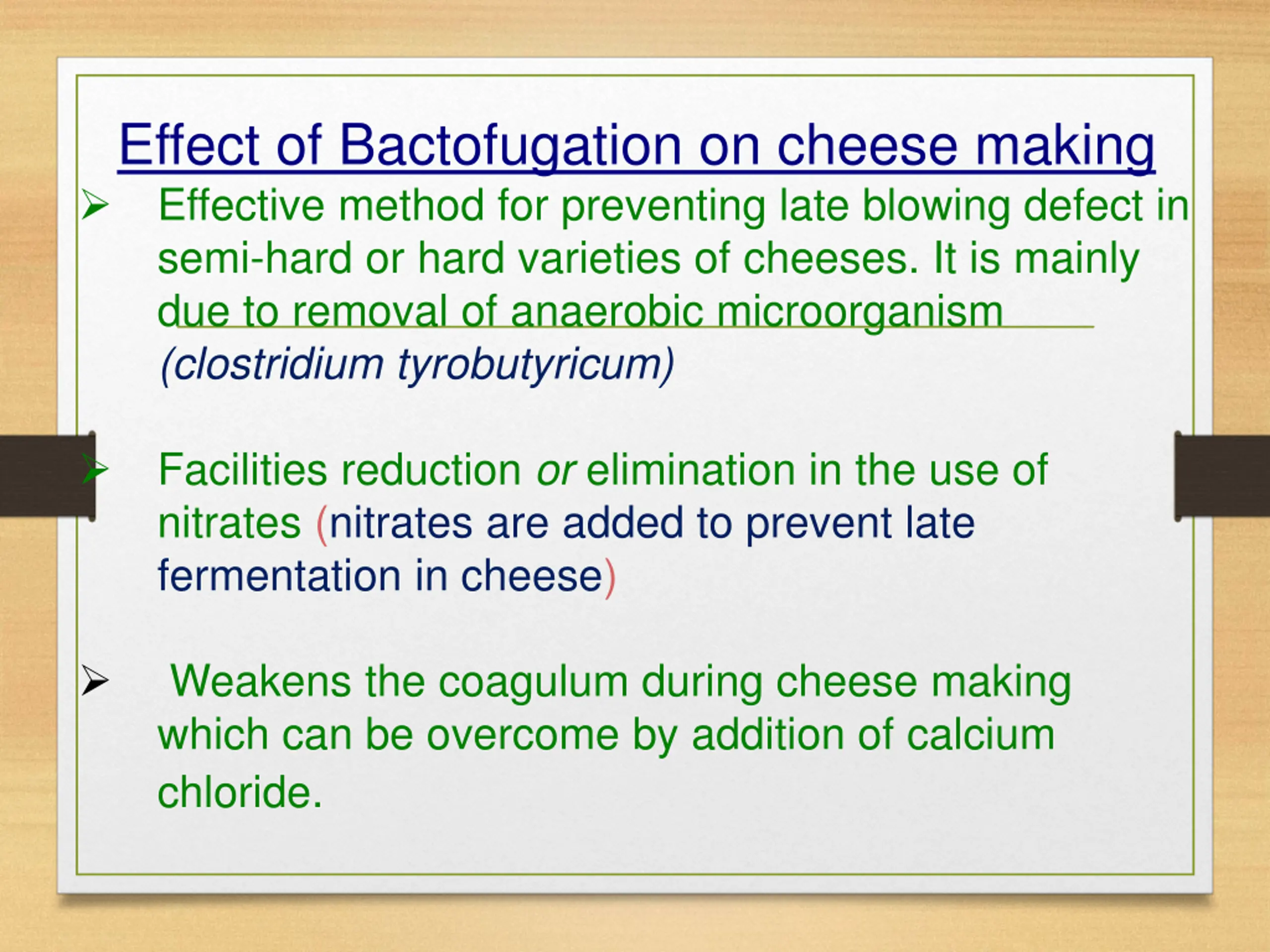 Effect of Bactofugation on cheese making Effective method for preventing late blowing defect in semi-hard or hard varieties of cheeses. It is mainly due to removal of anaerobic microorganism (clostridium tyrobutyricum) Facilities reduction or elimination in the use of nitrates (nitrates are added to prevent late fermentation in cheese) Weakens the coagulum during cheese making which can be overcome by addition of calcium chloride.