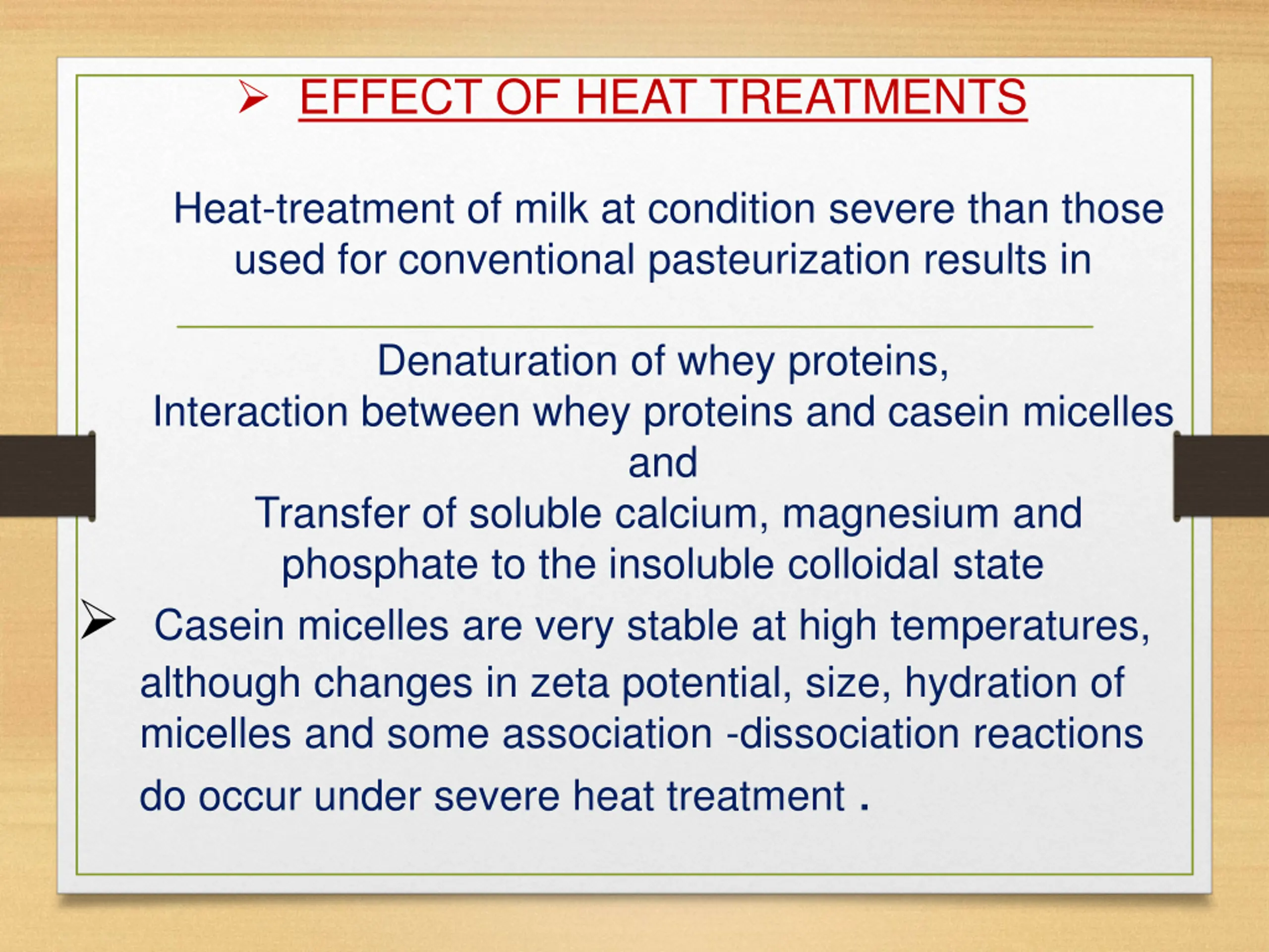 EFFECT OF HEAT TREATMENTS Heat-treatment of milk at condition severe than those used for conventional pasteurization results in Denaturation of whey proteins, Interaction between whey proteins and casein micelles and Transfer of soluble calcium, magnesium and phosphate to the insoluble colloidal state Casein micelles are very stable at high temperatures, although changes in zeta potential, size, hydration of micelles and some association -dissociation reactions do occur under severe heat treatment .