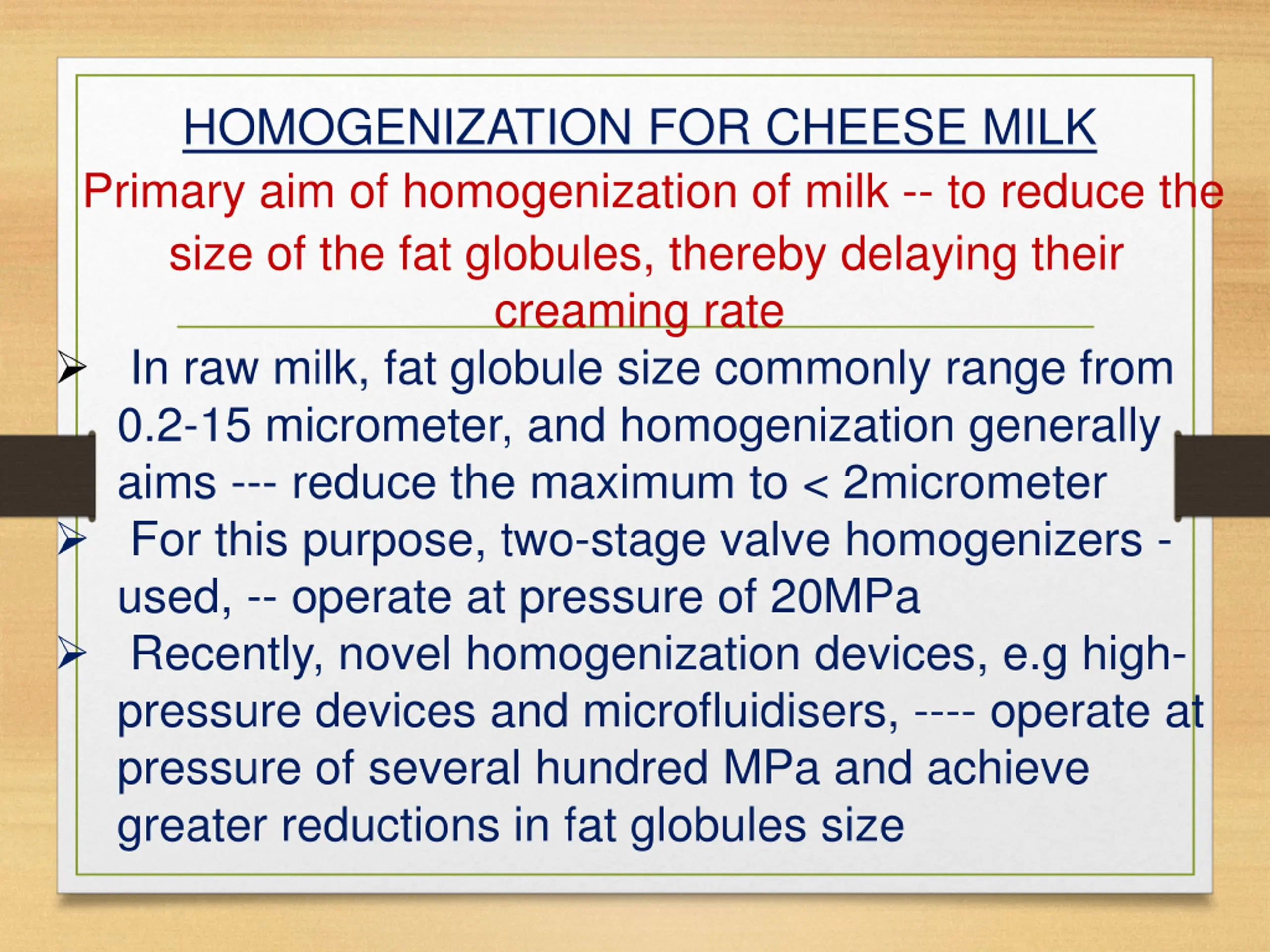 HOMOGENIZATION FOR CHEESE MILK Primary aim of homogenization of milk -- to reduce the size of the fat globules, thereby delaying their creaming rate In raw milk, fat globule size commonly range from 0.2-15 micrometer, and homogenization generally aims --- reduce the maximum to < 2micrometer For this purpose, two-stage valve homogenizers - used, -- operate at pressure of 20MPa Recently, novel homogenization devices, e.g high- pressure devices and microfluidisers, ---- operate at pressure of several hundred MPa and achieve greater reductions in fat globules size