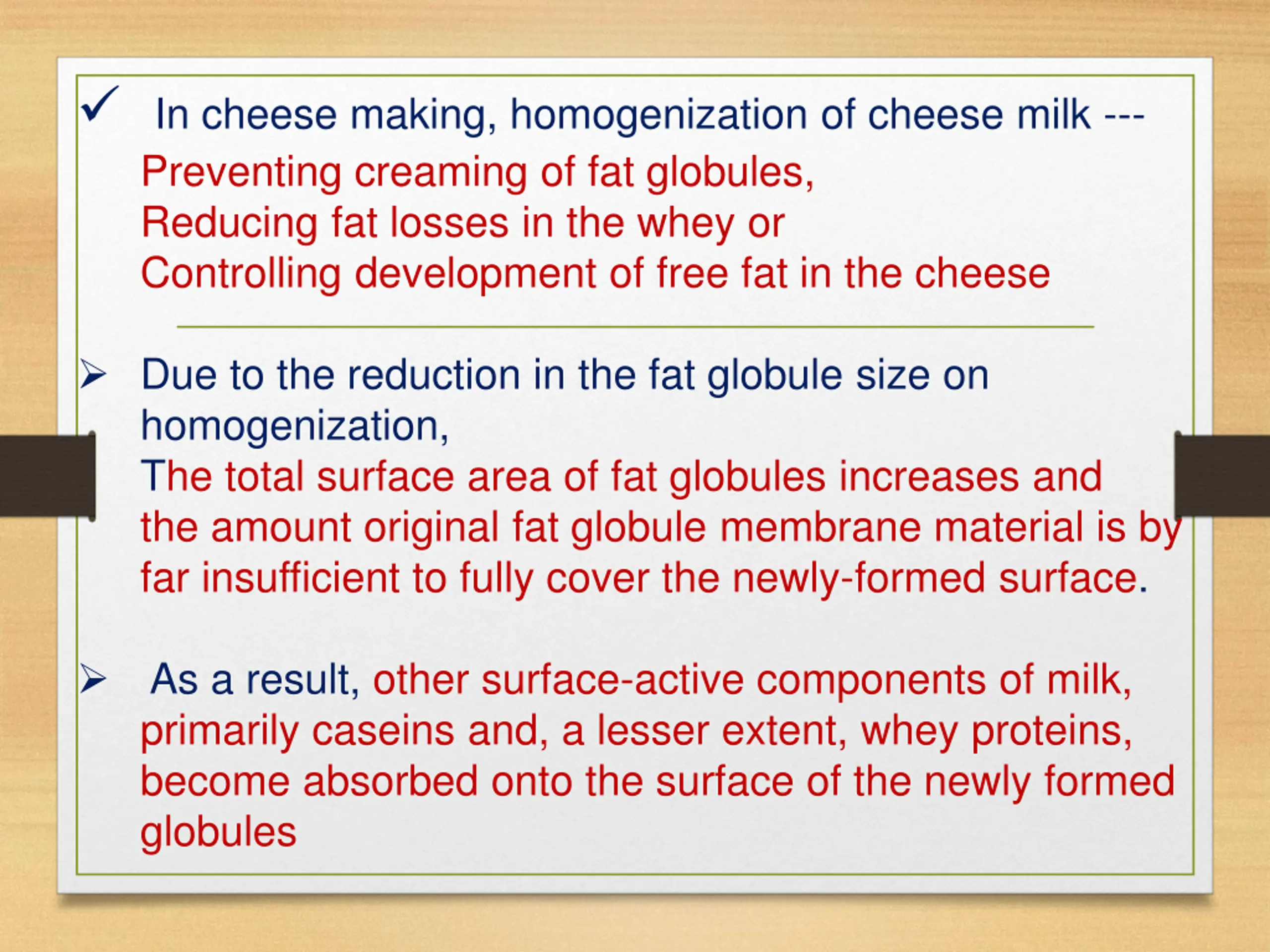 In cheese making, homogenization of cheese milk --- Preventing creaming of fat globules, Reducing fat losses in the whey or Controlling development of free fat in the cheese Due to the reduction in the fat globule size on homogenization, The total surface area of fat globules increases and the amount original fat globule membrane material is by far insufficient to fully cover the newly-formed surface. As a result, other surface-active components of milk, primarily caseins and, a lesser extent, whey proteins, become absorbed onto the surface of the newly formed globules