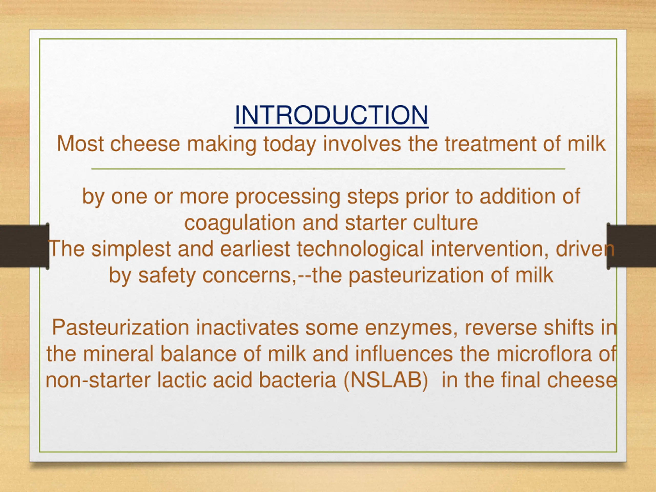 INTRODUCTION Most cheese making today involves the treatment of milk by one or more processing steps prior to addition of coagulation and starter culture The simplest and earliest technological intervention, driven by safety concerns,--the pasteurization of milk Pasteurization inactivates some enzymes, reverse shifts in the mineral balance of milk and influences the microflora of non-starter lactic acid bacteria (NSLAB) in the final cheese