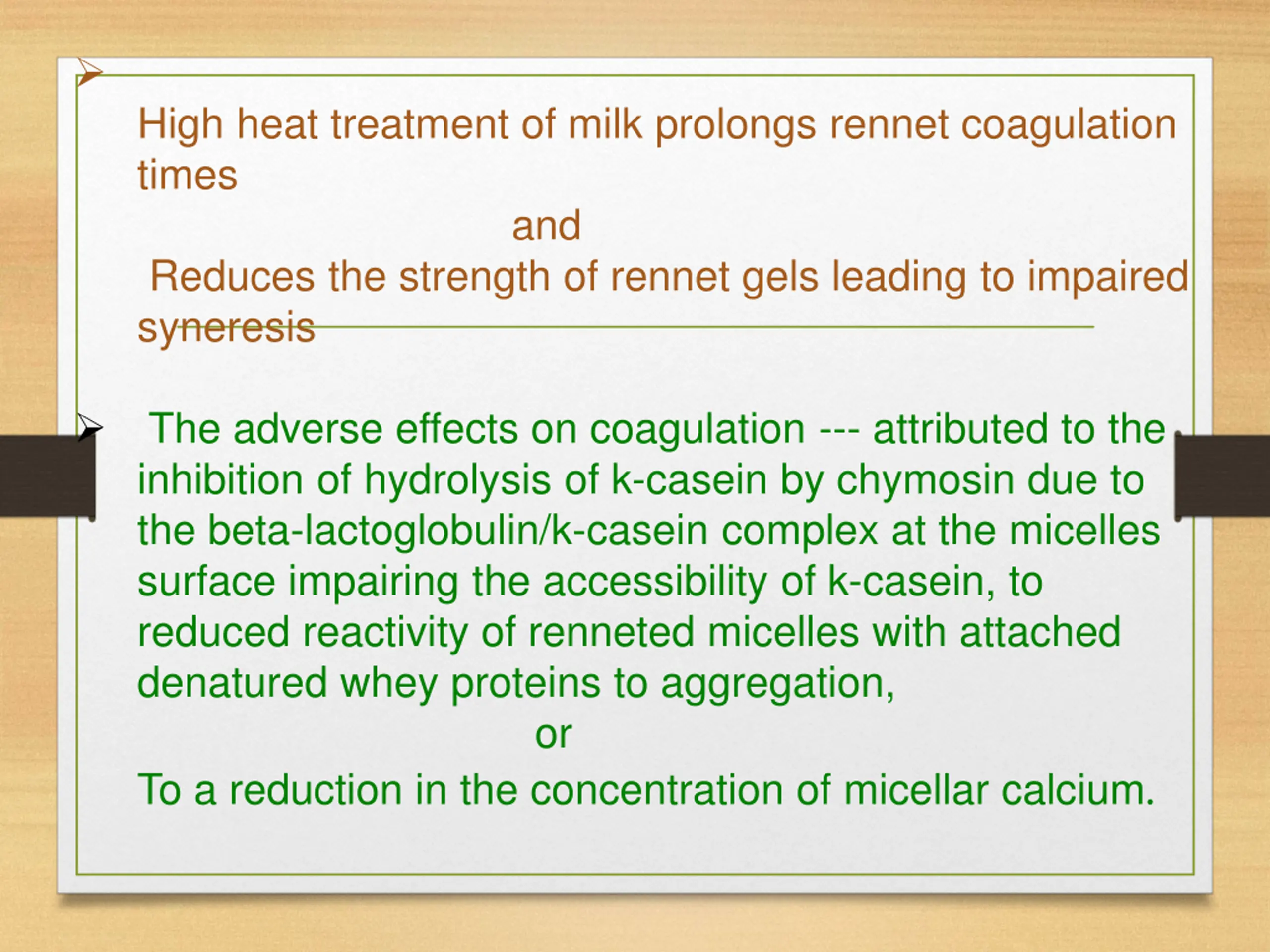 High heat treatment of milk prolongs rennet coagulation times and Reduces the strength of rennet gels leading to impaired syneresis The adverse effects on coagulation --- attributed to the inhibition of hydrolysis of k-casein by chymosin due to the beta-lactoglobulin/k-casein complex at the micelles surface impairing the accessibility of k-casein, to reduced reactivity of renneted micelles with attached denatured whey proteins to aggregation, or To a reduction in the concentration of micellar calcium.