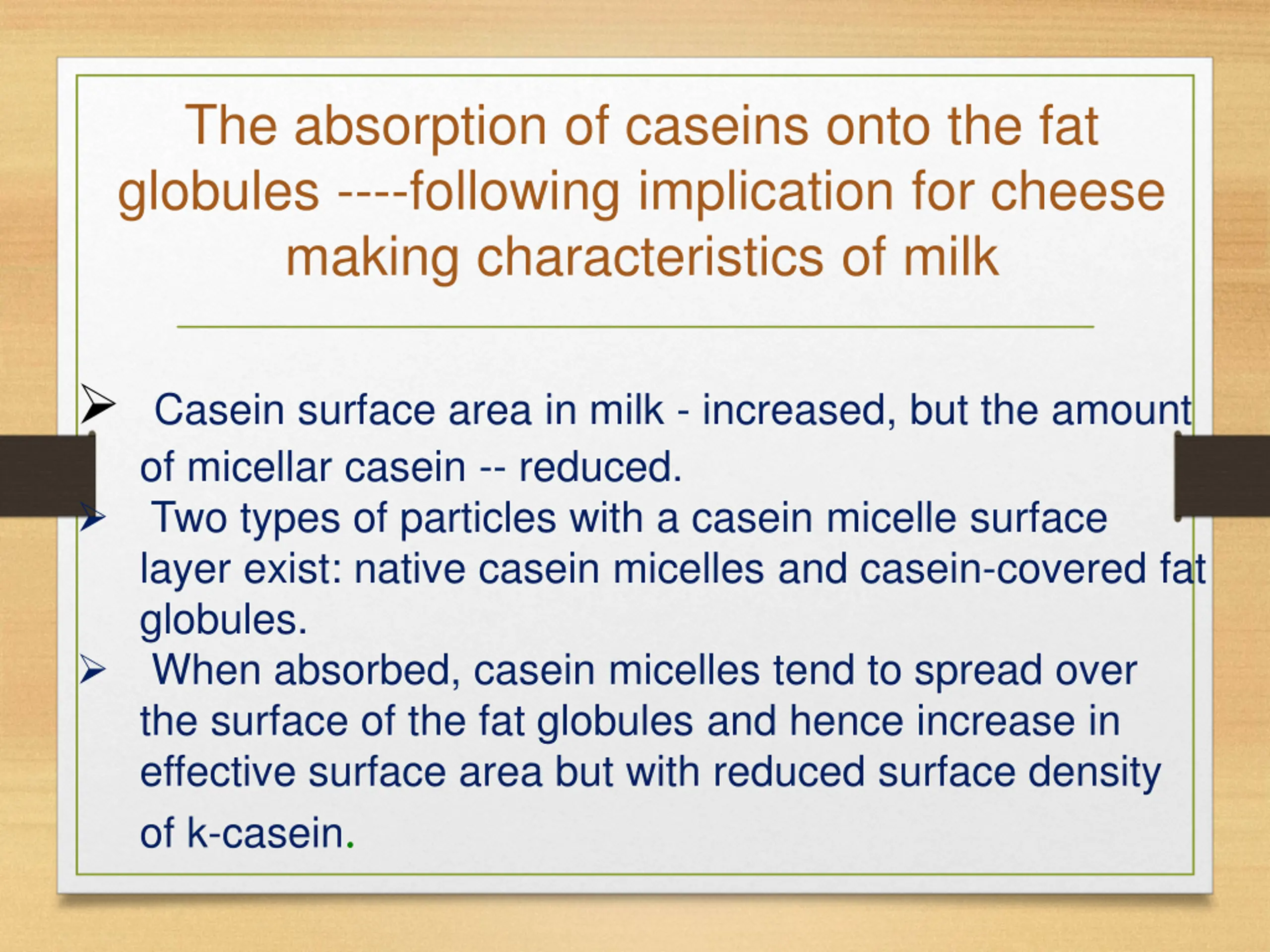 The absorption of caseins onto the fat globules ----following implication for cheese making characteristics of milk Casein surface area in milk - increased, but the amount of micellar casein -- reduced. Two types of particles with a casein micelle surface layer exist: native casein micelles and casein-covered fat globules. When absorbed, casein micelles tend to spread over the surface of the fat globules and hence increase in effective surface area but with reduced surface density of k-casein.