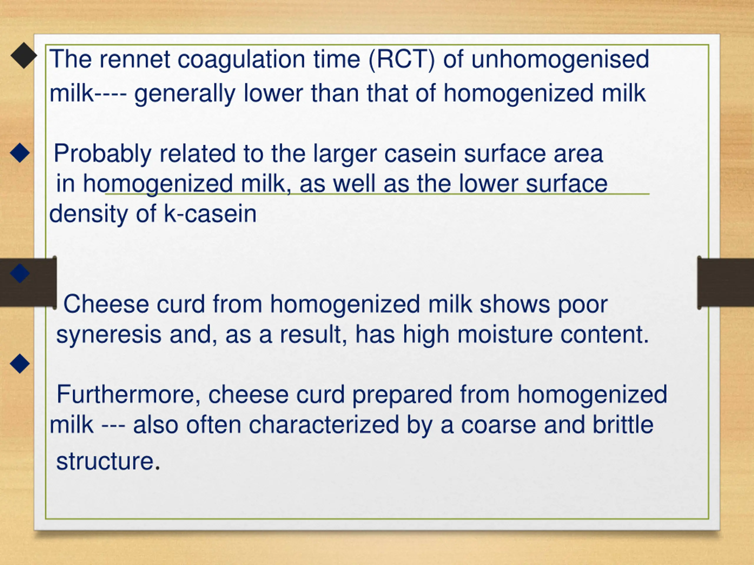 u The rennet coagulation time (RCT) of unhomogenised milk---- generally lower than that of homogenized milk u Probably related to the larger casein surface area in homogenized milk, as well as the lower surface density of k-casein u u Cheese curd from homogenized milk shows poor syneresis and, as a result, has high moisture content. Furthermore, cheese curd prepared from homogenized milk --- also often characterized by a coarse and brittle structure.