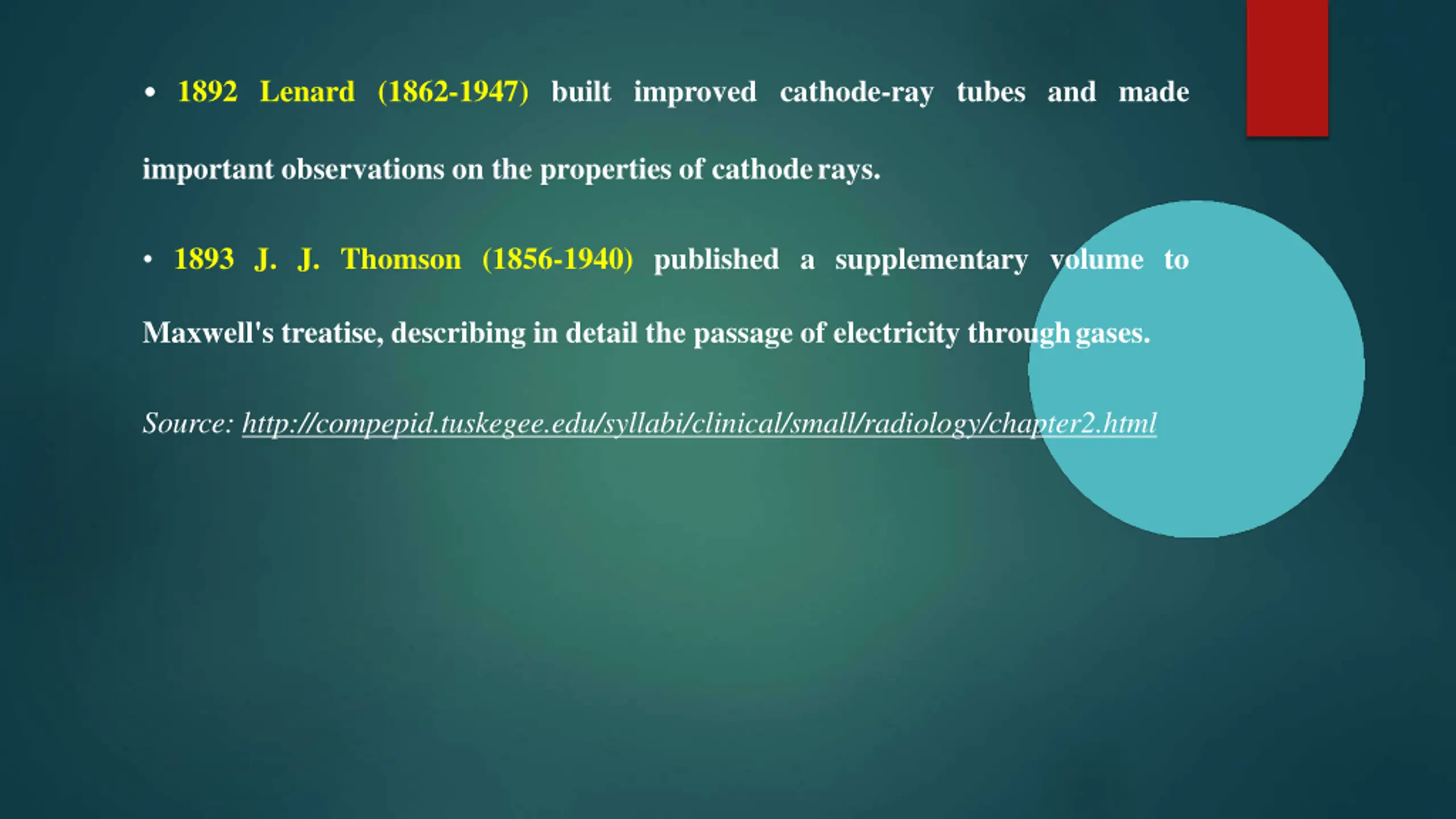 1892 Lenard (1862-1947) built improved cathode-ray tubes and made important observations on the properties of cathoderays. 1893 J. J. Thomson (1856-1940) published a supplementary volume to Maxwell's treatise, describing in detail the passage of electricity throughgases. Source: http://compepid.tuskegee.edu/syllabi/clinical/small/radiology/chapter2.html