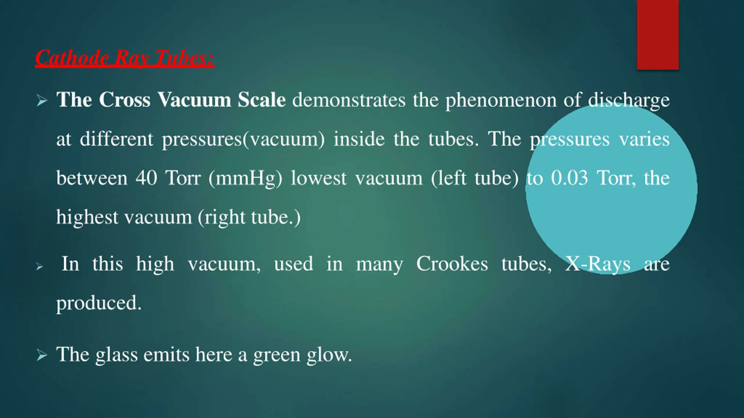 Cathode Ray Tubes: The Cross Vacuum Scale demonstrates the phenomenon of discharge at different pressures(vacuum) inside the tubes. The pressures varies between 40 Torr (mmHg) lowest vacuum (left tube) to 0.03 Torr, the highest vacuum (right tube.) In this high vacuum, used in many Crookes tubes, X-Rays are produced. The glass emits here a green glow.