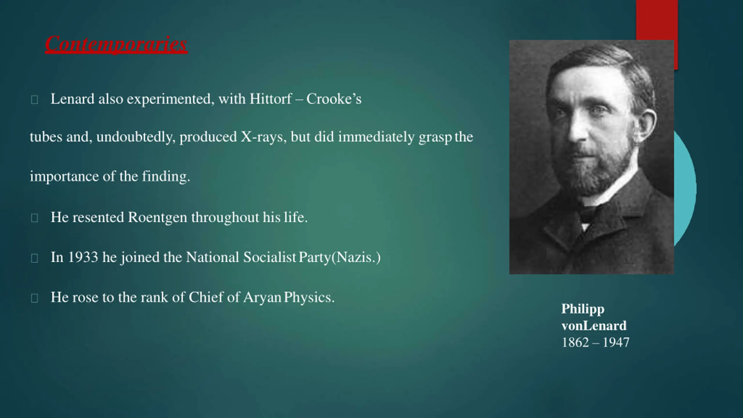 Contemporaries Lenard also experimented, with Hittorf Crooke s tubes and, undoubtedly, produced X-rays, but did immediately graspthe importance of the finding. He resented Roentgen throughout hislife. In 1933 he joined the National SocialistParty(Nazis.) He rose to the rank of Chief of AryanPhysics. Philipp vonLenard 1862 1947