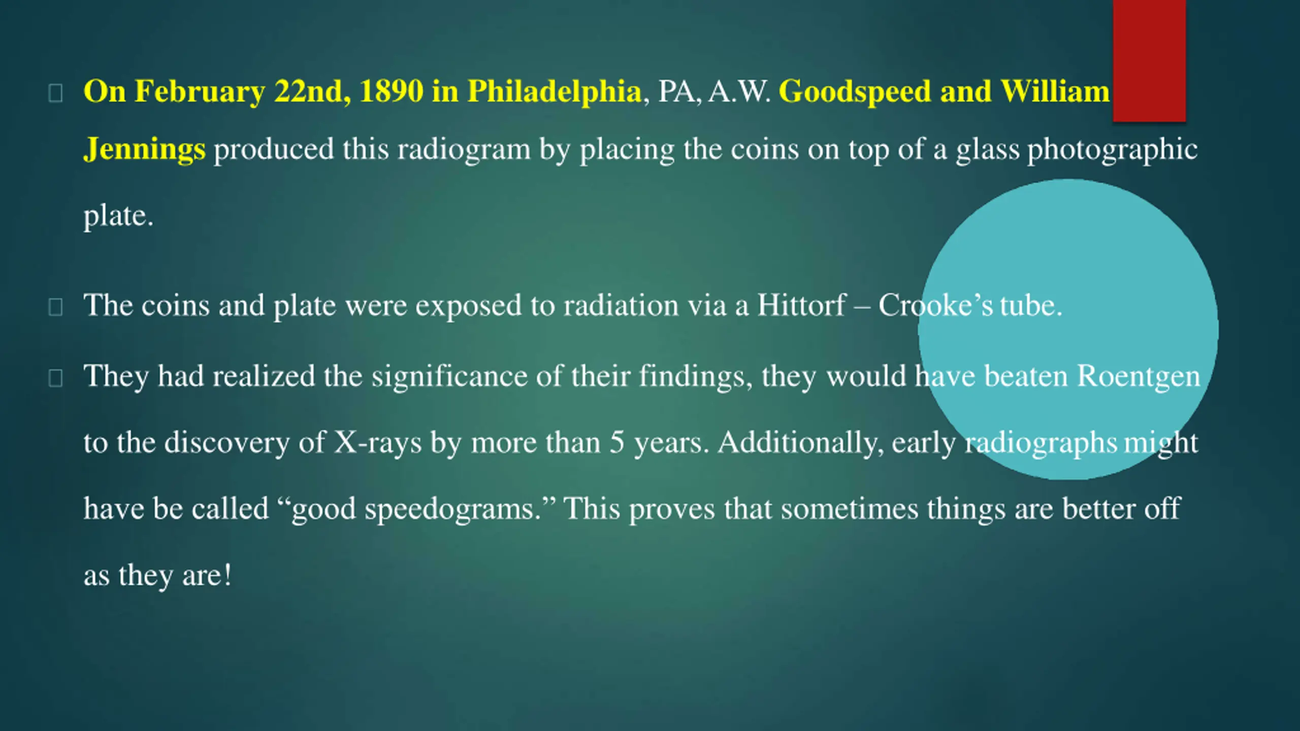 On February 22nd, 1890 in Philadelphia, PA, A.W. Goodspeed and William Jennings produced this radiogram by placing the coins on top of a glass photographic plate. The coins and plate were exposed to radiation via a Hittorf Crooke stube. They had realized the significance of their findings, they would have beaten Roentgen to the discovery of X-rays by more than 5 years. Additionally, early radiographsmight have be called good speedograms. This proves that sometimes things are better off as they are!