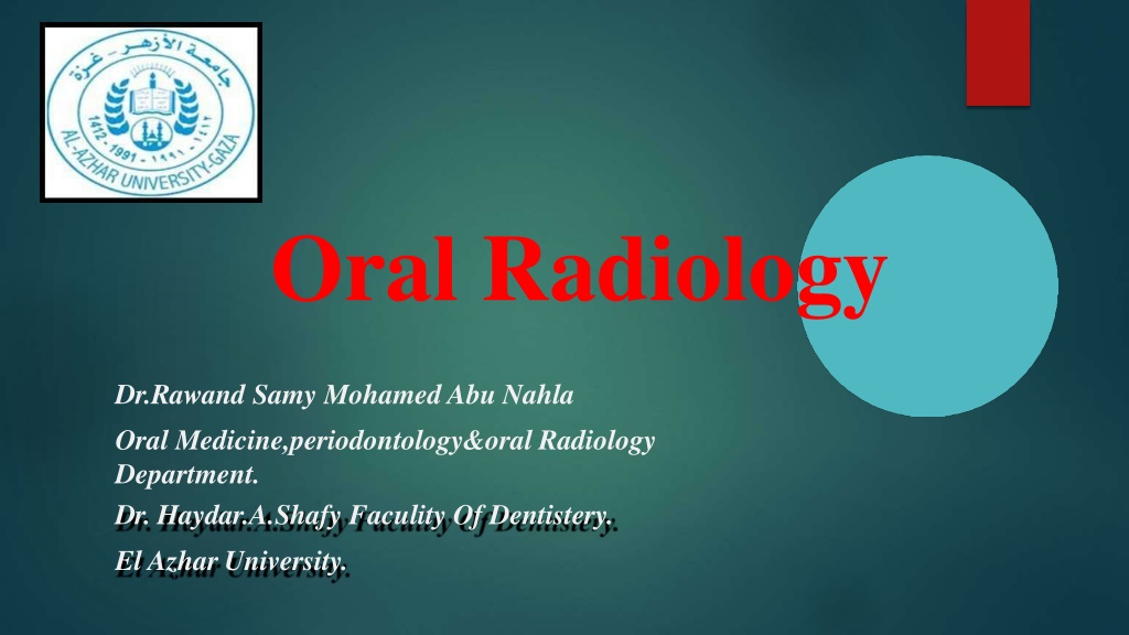 Oral Radiology Dr.Rawand Samy Mohamed Abu Nahla Oral Medicine,periodontology&oral Radiology Department. Dr. Haydar.A.Shafy Faculity Of Dentistery. El Azhar University.