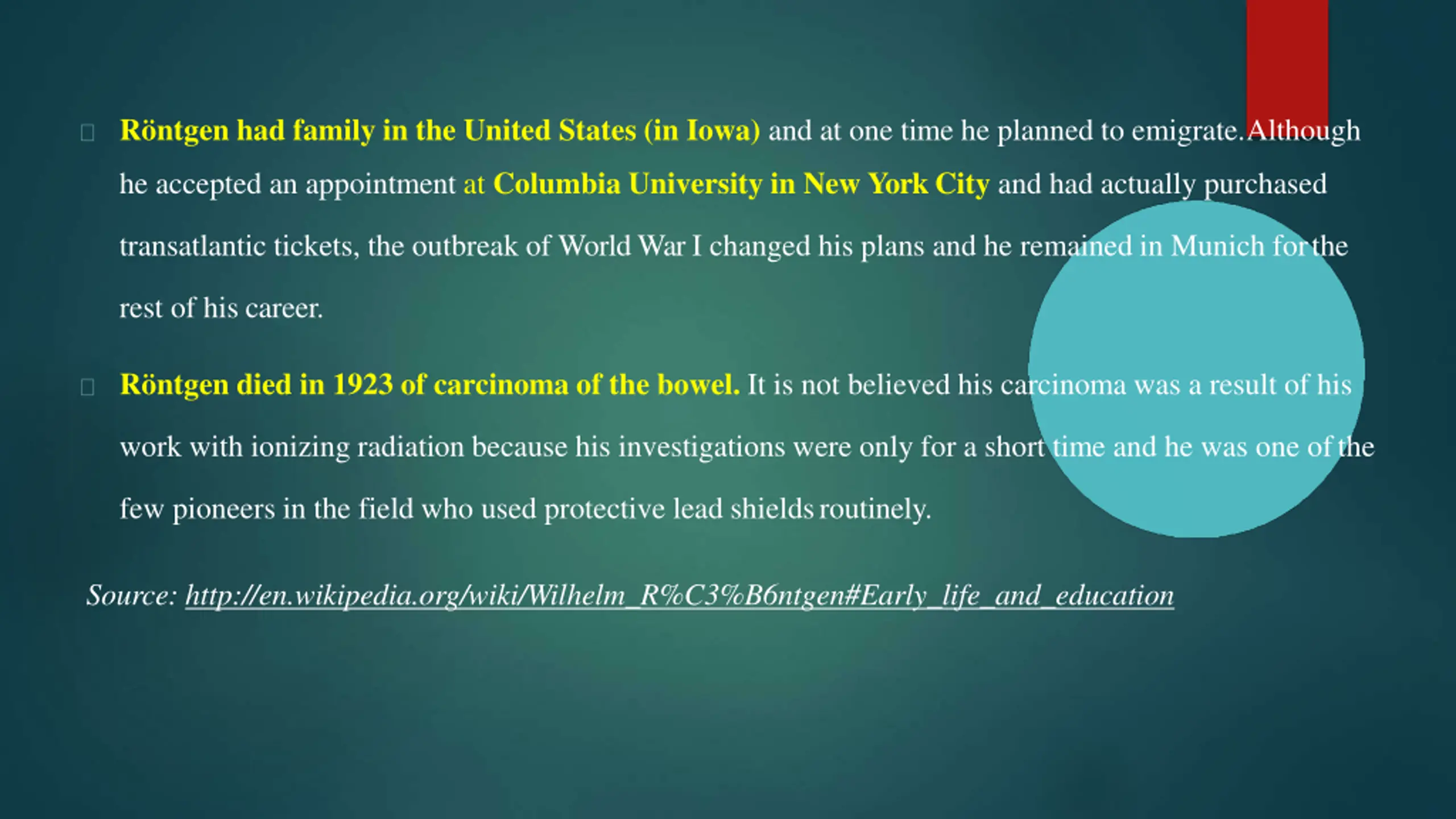 Rntgen had family in the United States (in Iowa) and at one time he planned to emigrate.Although he accepted an appointment at Columbia University in New York City and had actually purchased transatlantic tickets, the outbreak of World War I changed his plans and he remained in Munich forthe rest of his career. R ntgen died in 1923 of carcinoma of the bowel. It is not believed his carcinoma was a result of his work with ionizing radiation because his investigations were only for a short time and he was one ofthe few pioneers in the field who used protective lead shieldsroutinely. Source: http://en.wikipedia.org/wiki/Wilhelm_R%C3%B6ntgen#Early_life_and_education