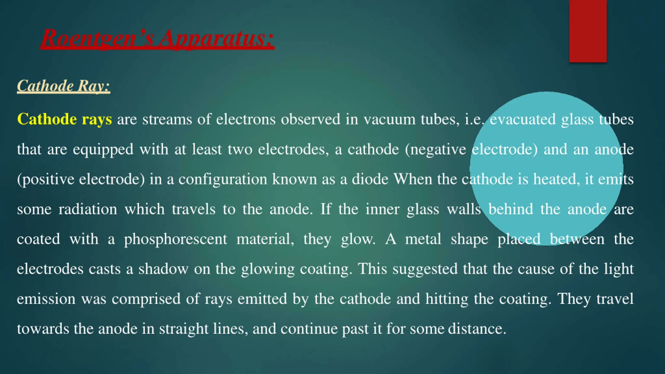 Roentgens Apparatus: Cathode Ray: Cathode rays are streams of electrons observed in vacuum tubes, i.e. evacuated glass tubes that are equipped with at least two electrodes, a cathode (negative electrode) and an anode (positive electrode) in a configuration known as a diode When the cathode is heated, it emits some radiation which travels to the anode. If the inner glass walls behind the anode are coated with a phosphorescent material, they glow. A metal shape placed between the electrodes casts a shadow on the glowing coating. This suggested that the cause of the light emission was comprised of rays emitted by the cathode and hitting the coating. They travel towards the anode in straight lines, and continue past it for somedistance.