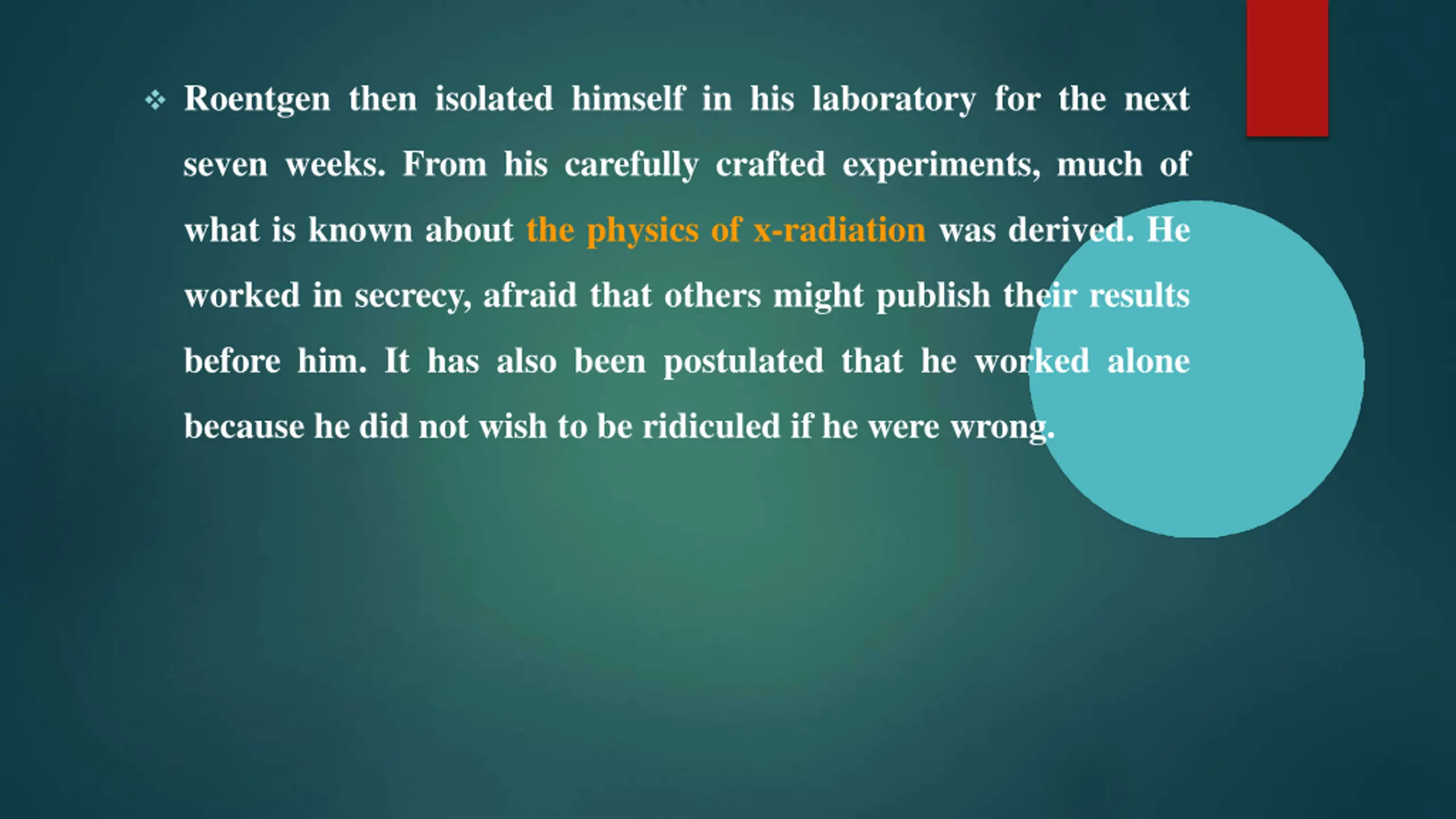 Roentgen then isolated himself in his laboratory for the next seven weeks. From his carefully crafted experiments, much of what is known about the physics of x-radiation was derived. He worked in secrecy, afraid that others might publish their results before him. It has also been postulated that he worked alone because he did not wish to be ridiculed if he were wrong.