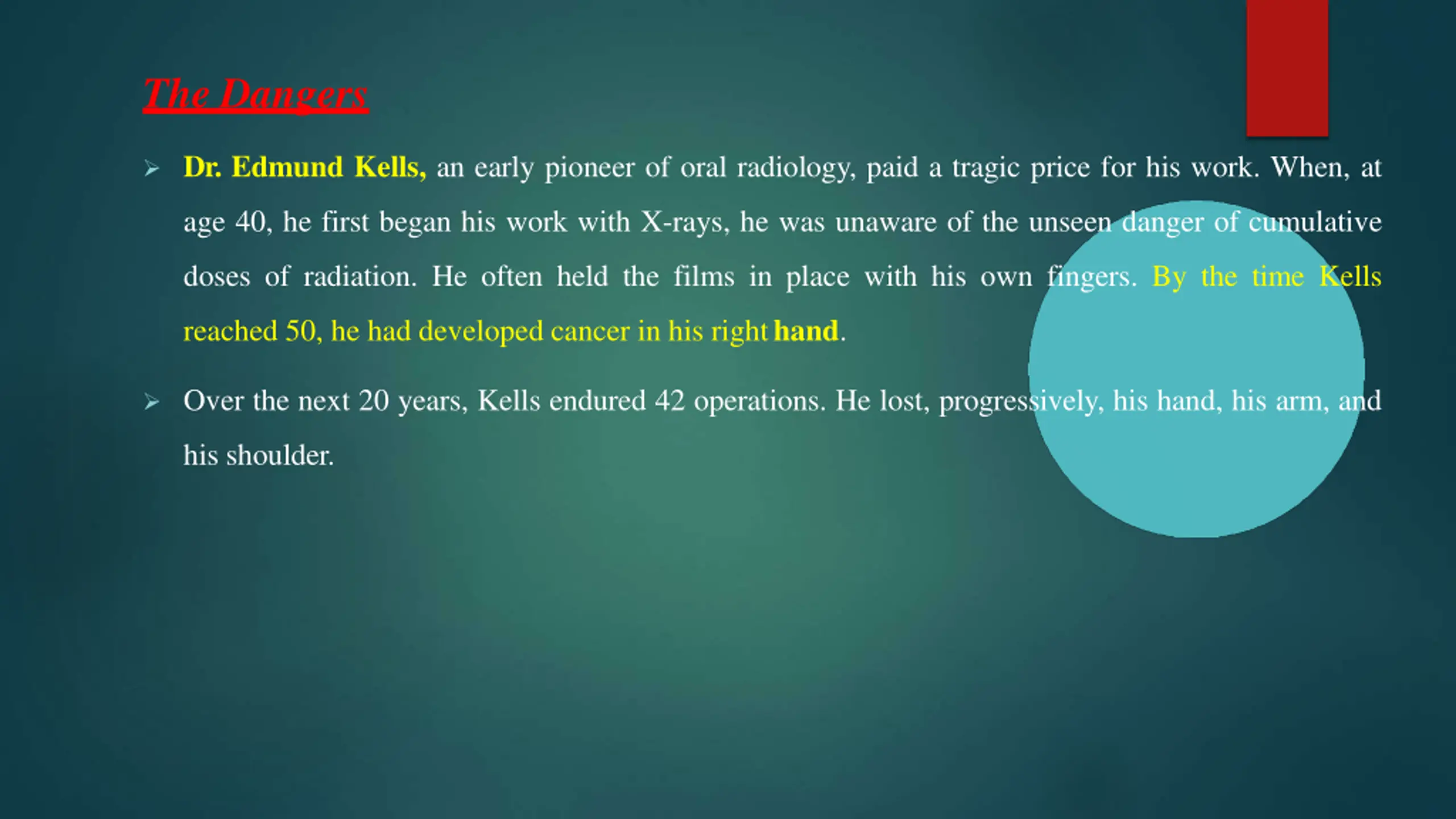 The Dangers Dr. Edmund Kells, an early pioneer of oral radiology, paid a tragic price for his work. When, at age 40, he first began his work with X-rays, he was unaware of the unseen danger of cumulative doses of radiation. He often held the films in place with his own fingers. By the time Kells reached 50, he had developed cancer in his righthand. Over the next 20 years, Kells endured 42 operations. He lost, progressively, his hand, his arm, and his shoulder.