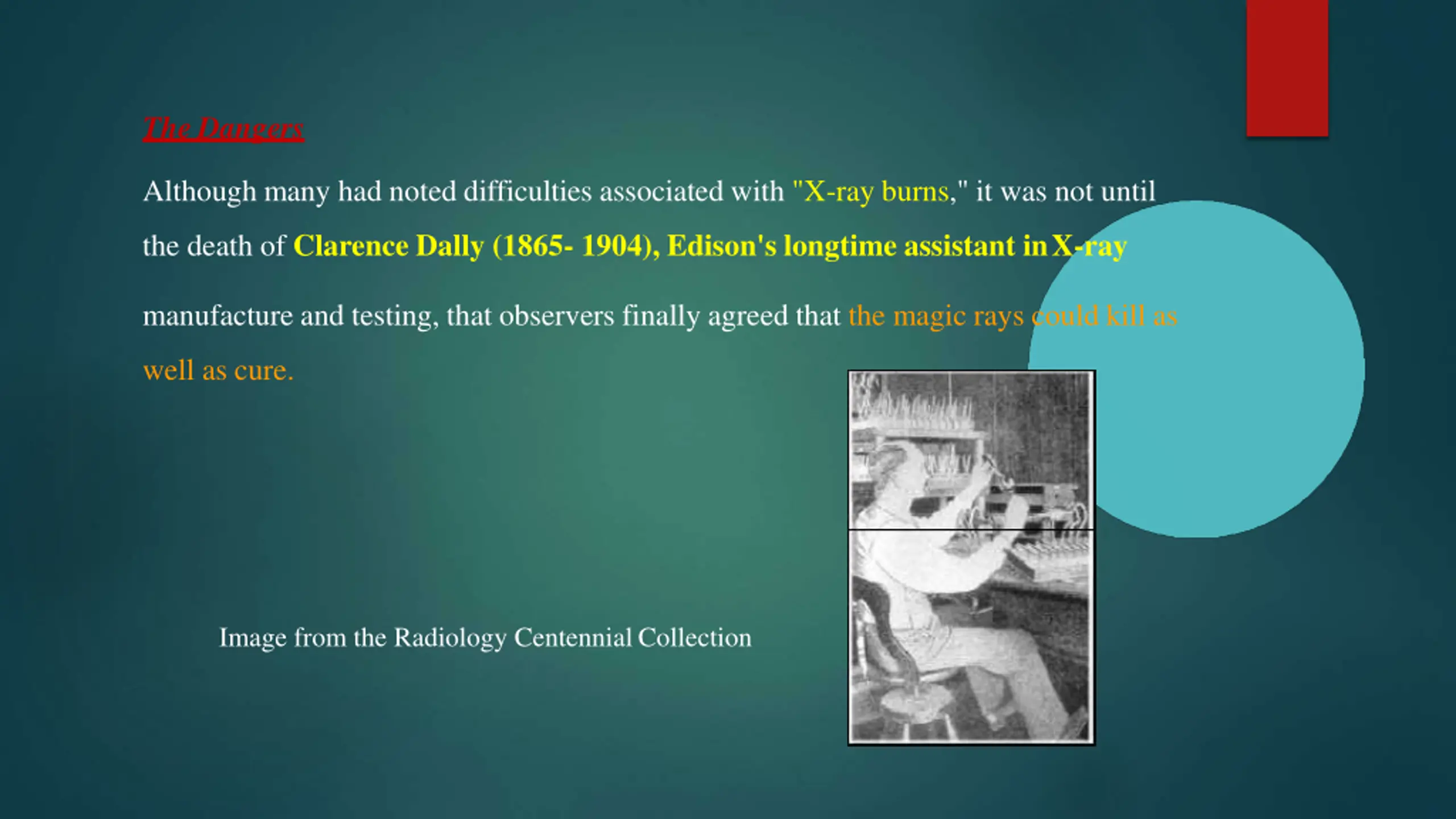 The Dangers Although many had noted difficulties associated with "X-ray burns," it was not until the death of Clarence Dally (1865- 1904), Edison's longtime assistant inX-ray manufacture and testing, that observers finally agreed that the magic rays could kill as well as cure. Image from the Radiology CentennialCollection