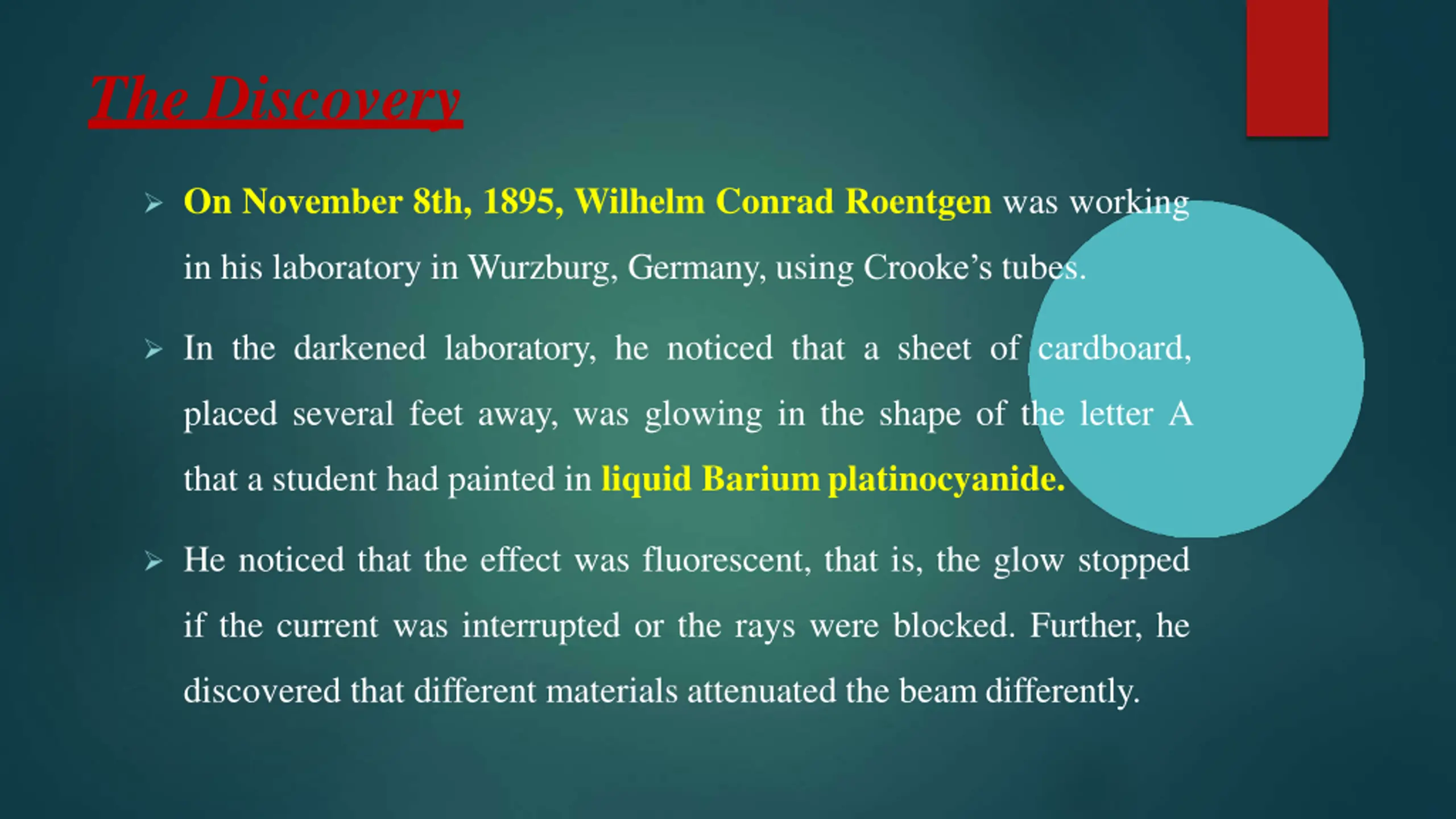 The Discovery On November 8th, 1895, Wilhelm Conrad Roentgen was working in his laboratory in Wurzburg, Germany, using Crooke s tubes. In the darkened laboratory, he noticed that a sheet of cardboard, placed several feet away, was glowing in the shape of the letter A that a student had painted in liquid Bariumplatinocyanide. He noticed that the effect was fluorescent, that is, the glow stopped if the current was interrupted or the rays were blocked. Further, he discovered that different materials attenuated the beam differently.