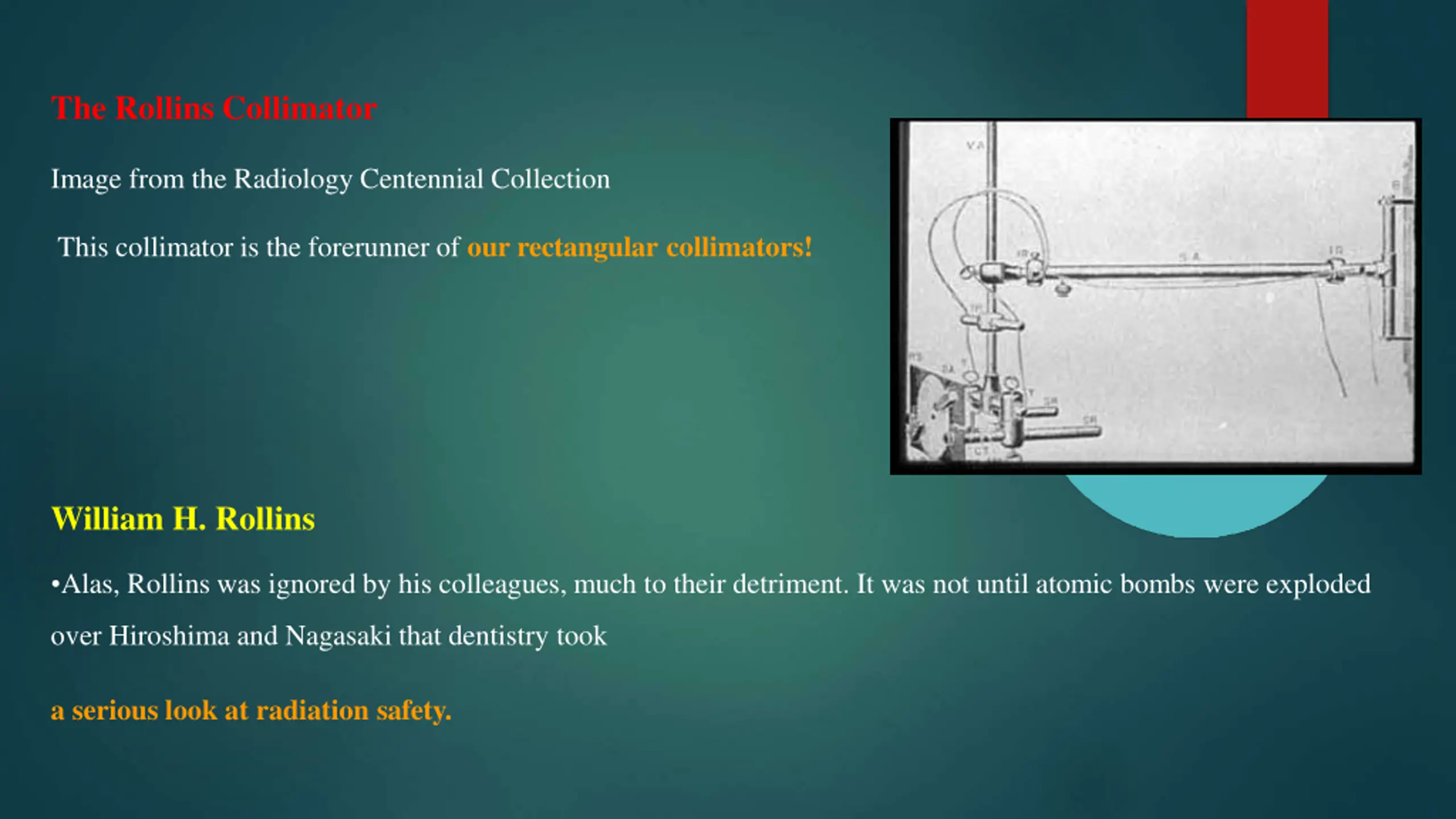 The Rollins Collimator Image from the Radiology Centennial Collection This collimator is the forerunner of our rectangular collimators! William H. Rollins Alas, Rollins was ignored by his colleagues, much to their detriment. It was not until atomic bombs were exploded over Hiroshima and Nagasaki that dentistry took a serious look at radiation safety.