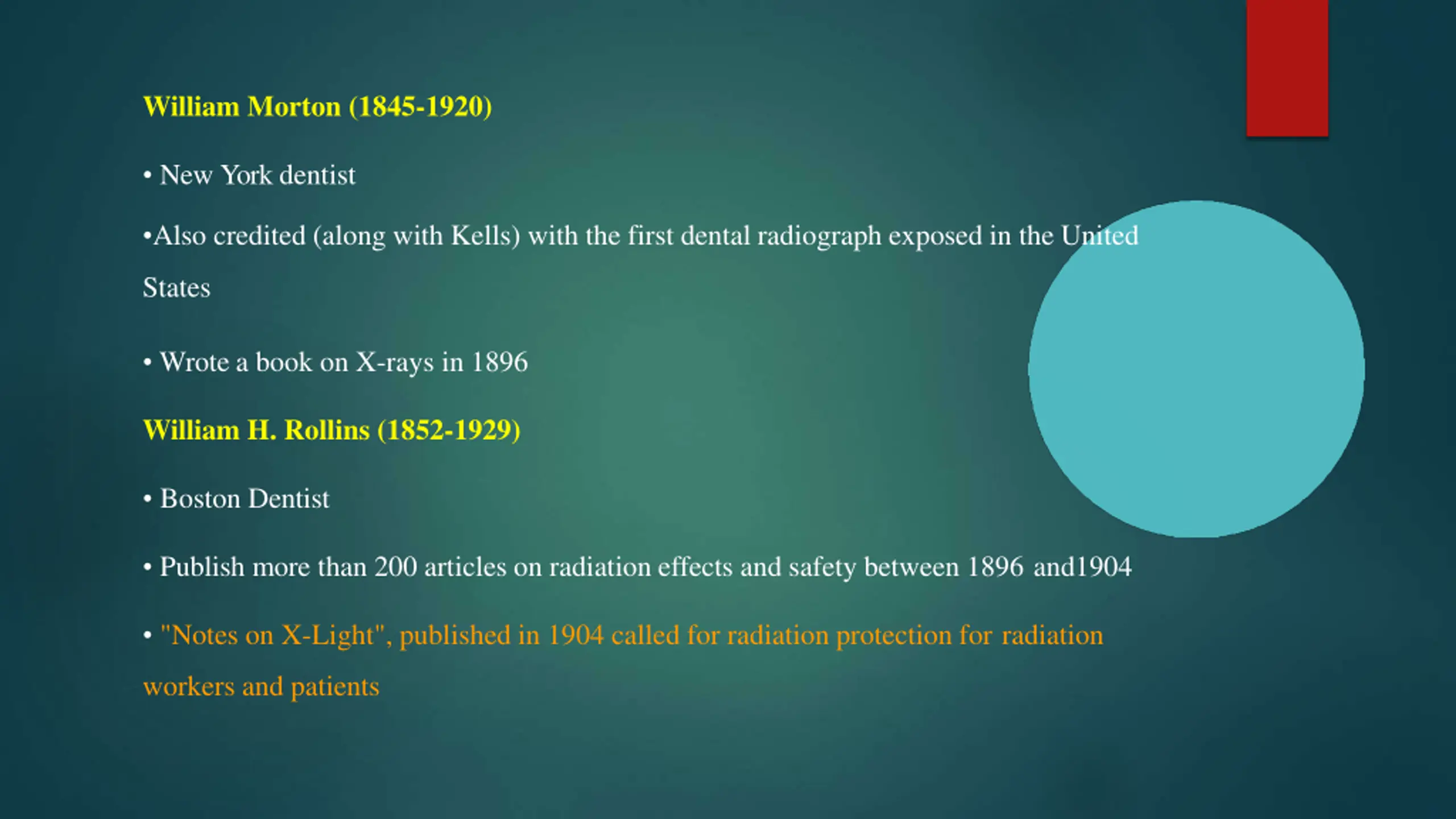 William Morton (1845-1920) New York dentist Also credited (along with Kells) with the first dental radiograph exposed in the United States Wrote a book on X-rays in 1896 William H. Rollins (1852-1929) Boston Dentist Publish more than 200 articles on radiation effects and safety between 1896 and1904 "Notes on X-Light", published in 1904 called for radiation protection for radiation workers and patients