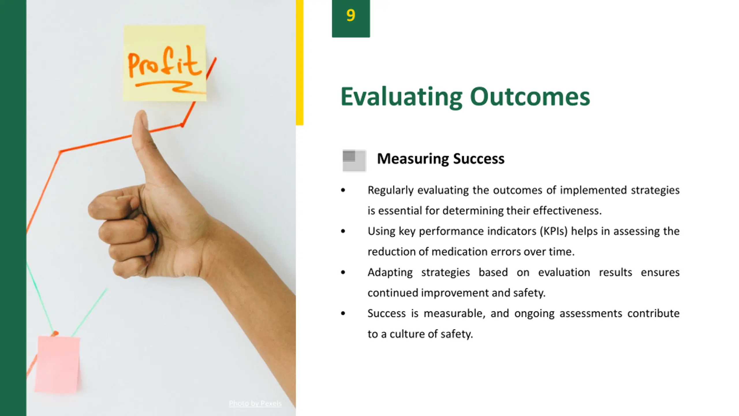 9 Evaluating Outcomes Measuring Success Regularly evaluating the outcomes of implemented strategies is essential for determining their effectiveness. Using key performance indicators (KPIs) helps in assessing the reduction of medication errors over time. Adapting strategies based on evaluation results ensures continued improvement and safety. Success is measurable, and ongoing assessments contribute to a culture of safety. Photo by Pexels