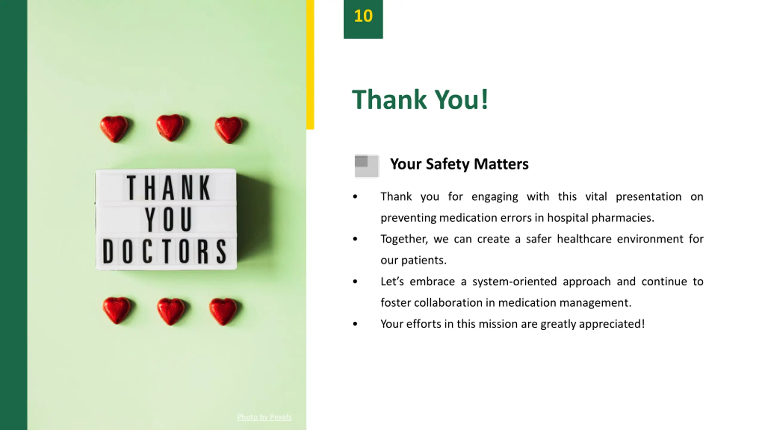 10 Thank You! Your Safety Matters Thank you for engaging with this vital presentation on preventingmedication errors in hospital pharmacies. Together, we can create a safer healthcare environment for our patients. Let s embrace a system-oriented approach and continue to foster collaboration in medication management. Your efforts in this mission are greatlyappreciated! Photo by Pexels