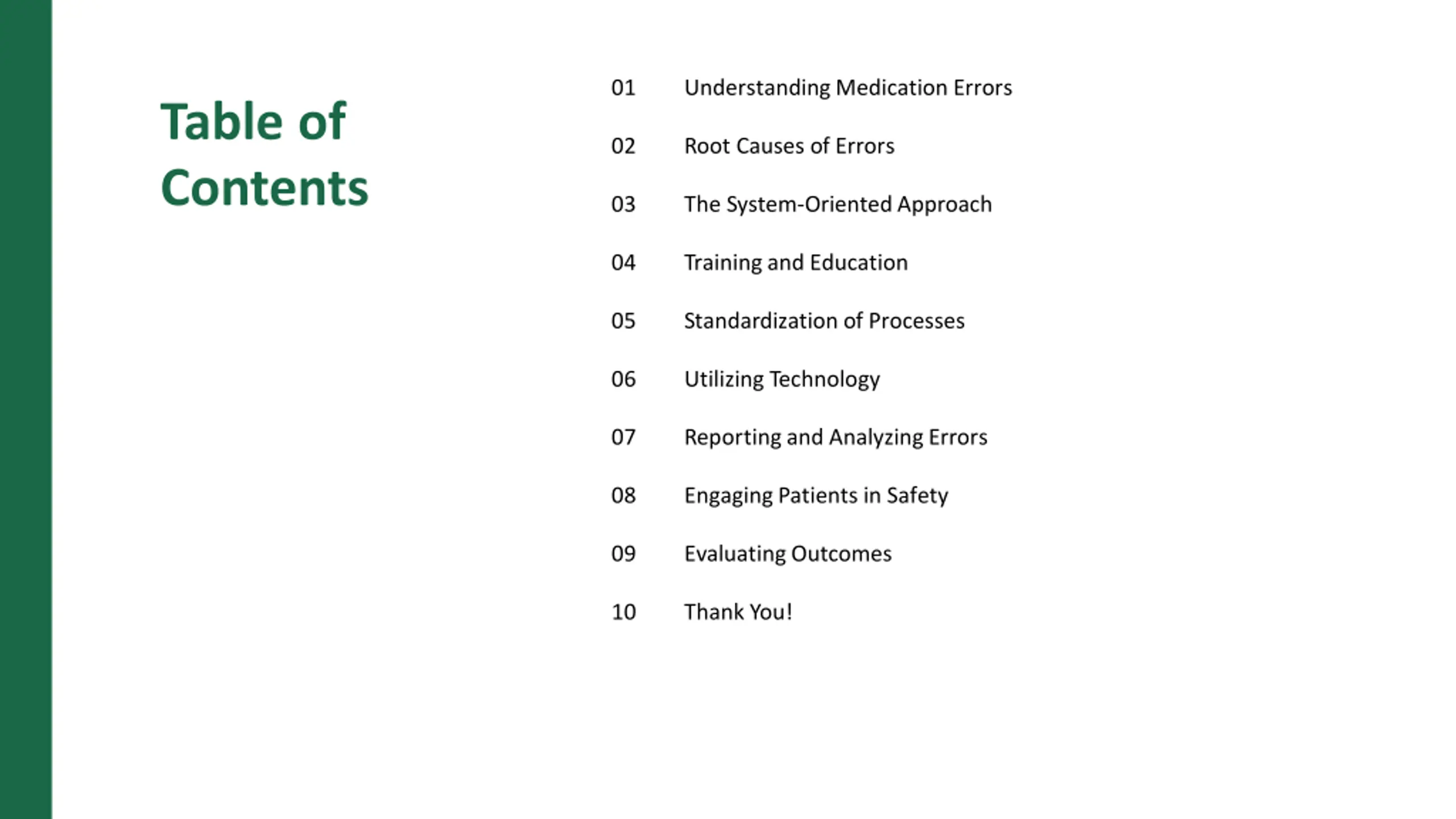 01 Understanding Medication Errors Table of Contents 02 Root Causes of Errors 03 The System-Oriented Approach 04 Training and Education 05 Standardization of Processes 06 Utilizing Technology 07 Reporting and Analyzing Errors 08 Engaging Patients in Safety 09 Evaluating Outcomes 10 Thank You!