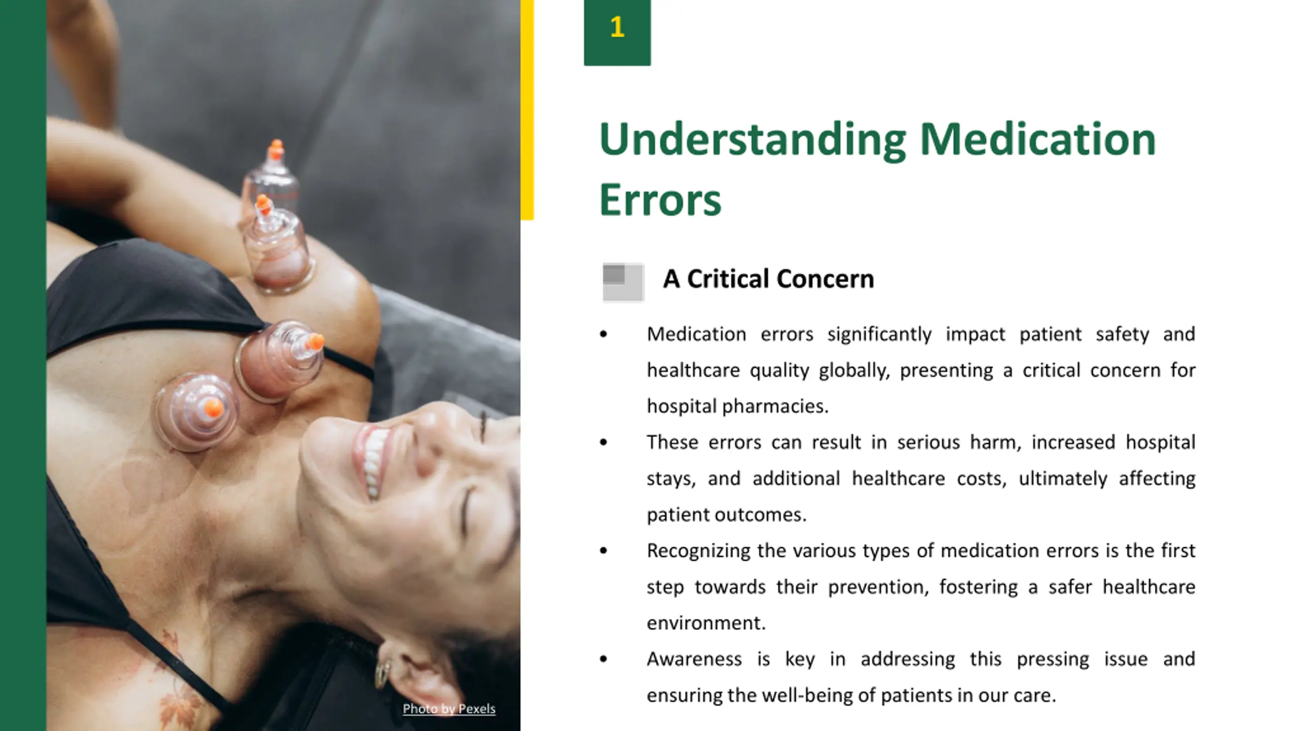 1 Understanding Medication Errors A Critical Concern Medication errors significantly impact patient safety and healthcare quality globally, presenting a critical concern for hospital pharmacies. These errors can result in serious harm, increased hospital stays, and additional healthcare costs, ultimately affecting patientoutcomes. Recognizing the various types of medication errors is the first step towards their prevention, fostering a safer healthcare environment. Awareness is key in addressing this pressing issue and ensuring the well-being of patients in our care. Photo by Pexels