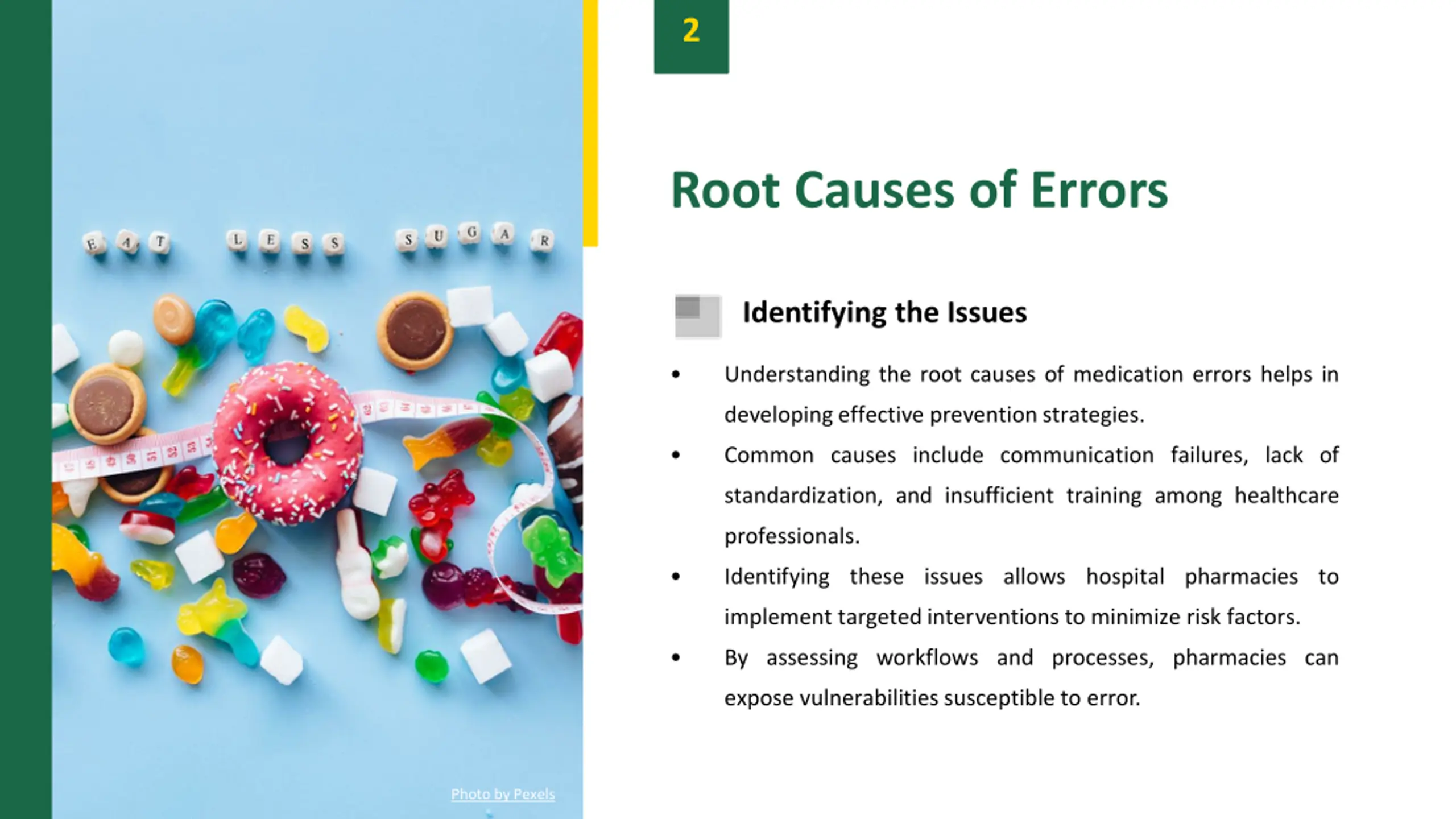 2 Root Causes of Errors Identifying the Issues Understanding the root causes of medication errors helps in developing effective preventionstrategies. Common causes include communication failures, lack of standardization, and insufficient training among healthcare professionals. Identifying these issues allows hospital pharmacies to implement targetedinterventions to minimize risk factors. By assessing workflows and processes, pharmacies can expose vulnerabilities susceptible to error. Photo by Pexels