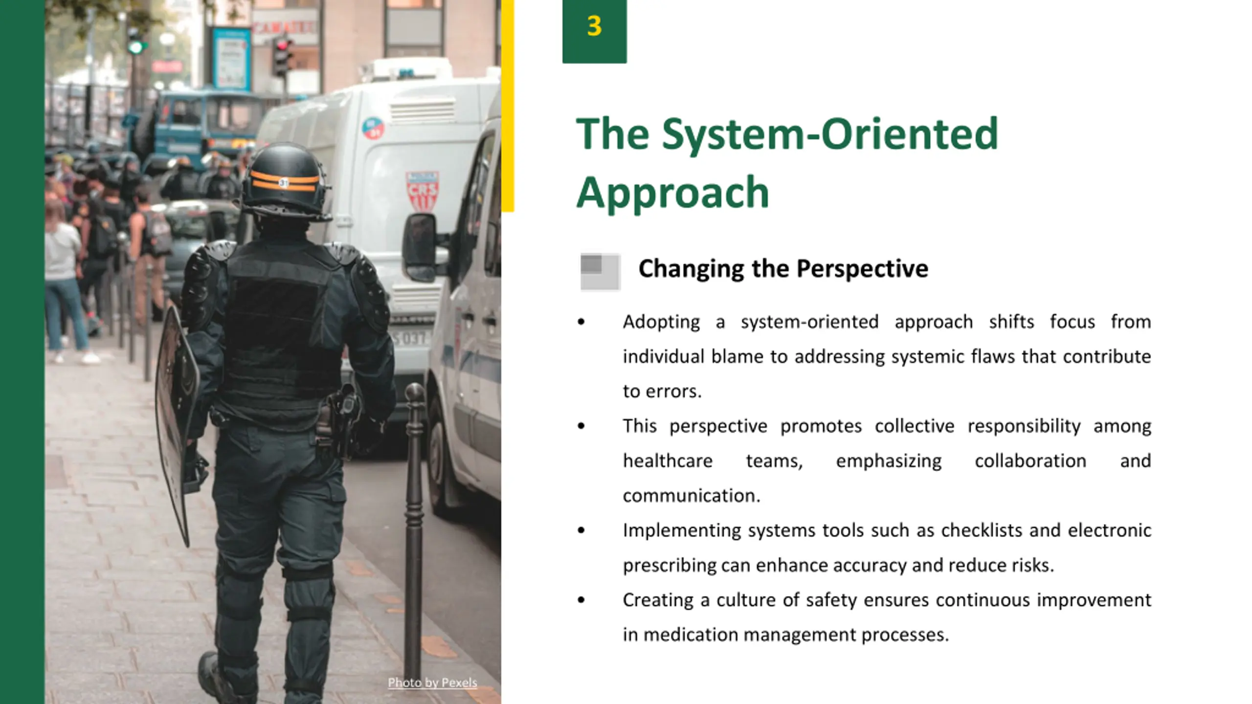 3 The System-Oriented Approach Changing the Perspective Adopting a system-oriented approach shifts focus from individual blame to addressing systemic flaws that contribute to errors. This perspective promotes collective responsibility among healthcare teams, emphasizing collaboration and communication. Implementing systems tools such as checklists and electronic prescribingcan enhance accuracy and reduce risks. Creating a culture of safety ensures continuous improvement in medication management processes. Photo by Pexels