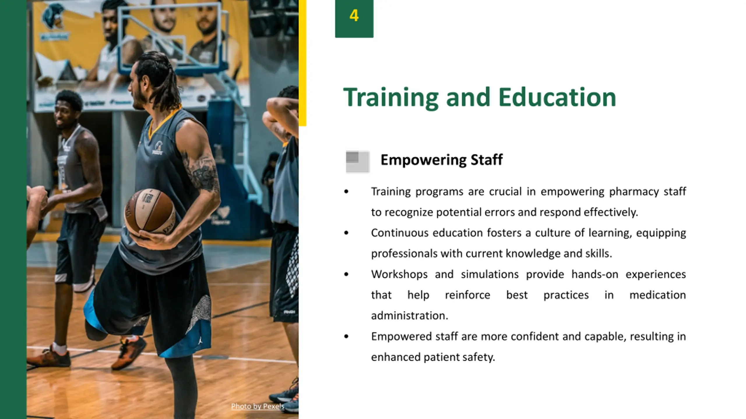 4 Training and Education Empowering Staff Training programs are crucial in empowering pharmacy staff to recognize potentialerrors and respondeffectively. Continuous education fosters a culture of learning, equipping professionals with current knowledge and skills. Workshops and simulations provide hands-on experiences that help reinforce best practices in medication administration. Empowered staff are more confident and capable, resulting in enhanced patientsafety. Photo by Pexels