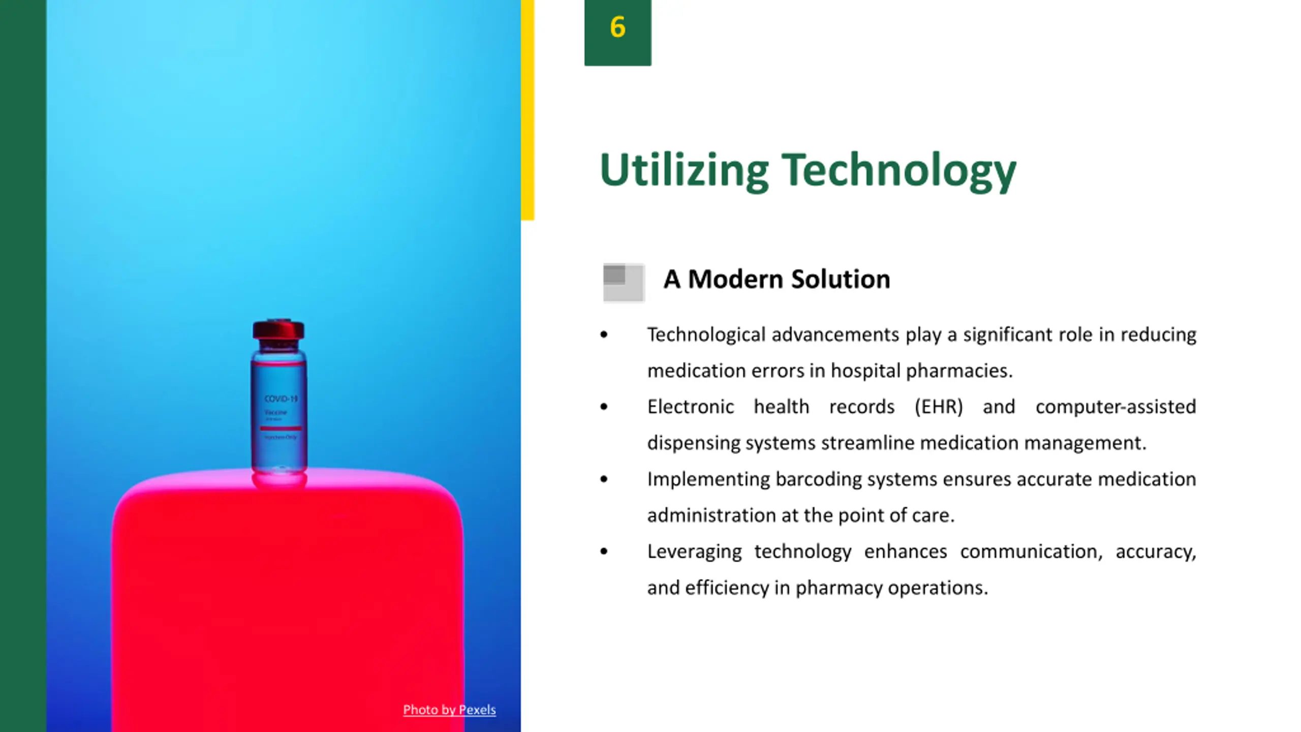 6 Utilizing Technology A Modern Solution Technological advancements play a significant role in reducing medication errors in hospital pharmacies. Electronic health records (EHR) and computer-assisted dispensing systems streamline medication management. Implementing barcoding systems ensures accurate medication administration at the point of care. Leveraging technology enhances communication, accuracy, and efficiency in pharmacy operations. Photo by Pexels