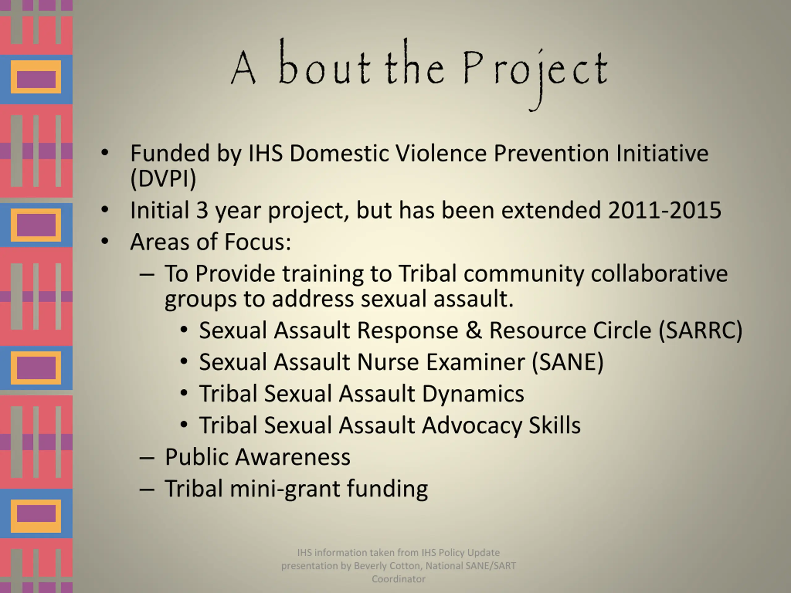 A bout the P roject Funded by IHS Domestic Violence Prevention Initiative (DVPI) Initial 3 year project, but has been extended 2011-2015 Areas of Focus: To Provide training to Tribal community collaborative groups to address sexual assault. Sexual Assault Response & Resource Circle (SARRC) Sexual Assault Nurse Examiner (SANE) Tribal Sexual Assault Dynamics Tribal Sexual Assault Advocacy Skills Public Awareness Tribal mini-grant funding IHS information taken from IHS Policy Update presentation by Beverly Cotton, National SANE/SART Coordinator