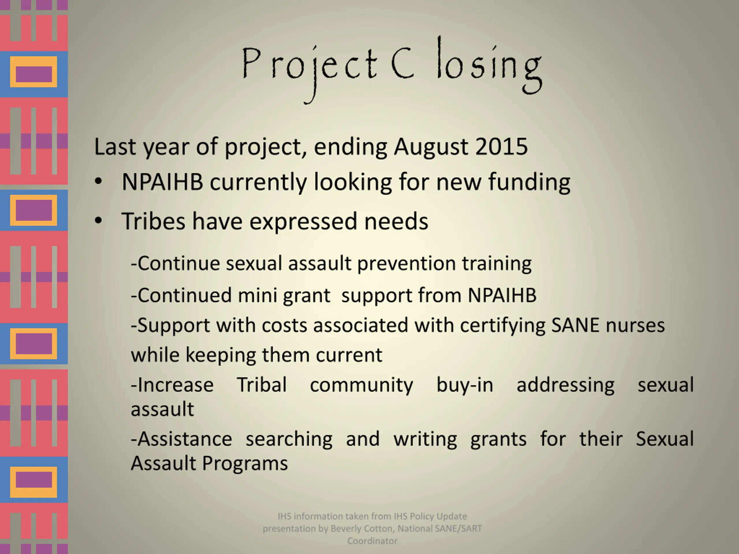 P roject C losing Last year of project, ending August 2015 NPAIHB currently looking for new funding Tribes have expressed needs -Continue sexual assault prevention training -Continued mini grant support from NPAIHB -Support with costs associated with certifying SANE nurses while keeping them current -Increase Tribal community buy-in addressing sexual assault -Assistance searching and writing grants for their Sexual Assault Programs IHS information taken from IHS Policy Update presentation by Beverly Cotton, National SANE/SART Coordinator