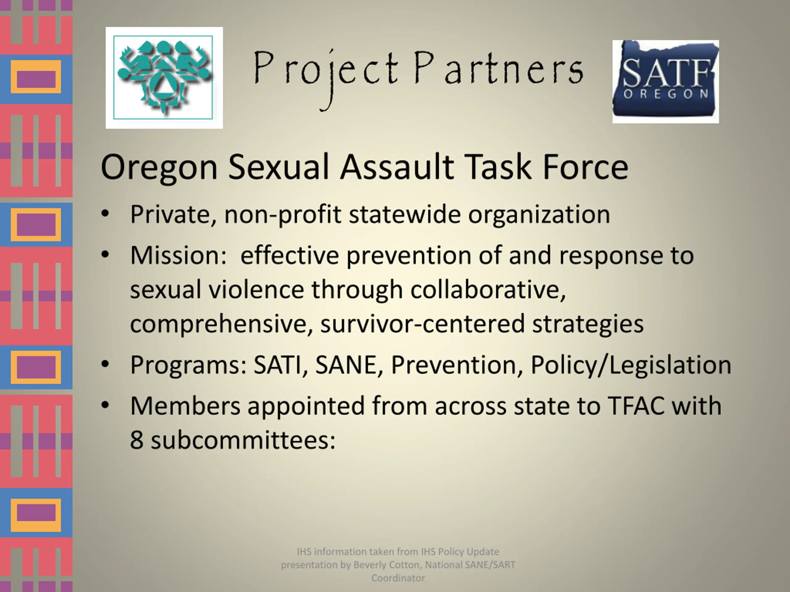 P roject P artners Oregon Sexual Assault Task Force Private, non-profit statewide organization Mission: effective prevention of and response to sexual violence through collaborative, comprehensive, survivor-centered strategies Programs: SATI, SANE, Prevention, Policy/Legislation Members appointed from across state to TFAC with 8 subcommittees: IHS information taken from IHS Policy Update presentation by Beverly Cotton, National SANE/SART Coordinator