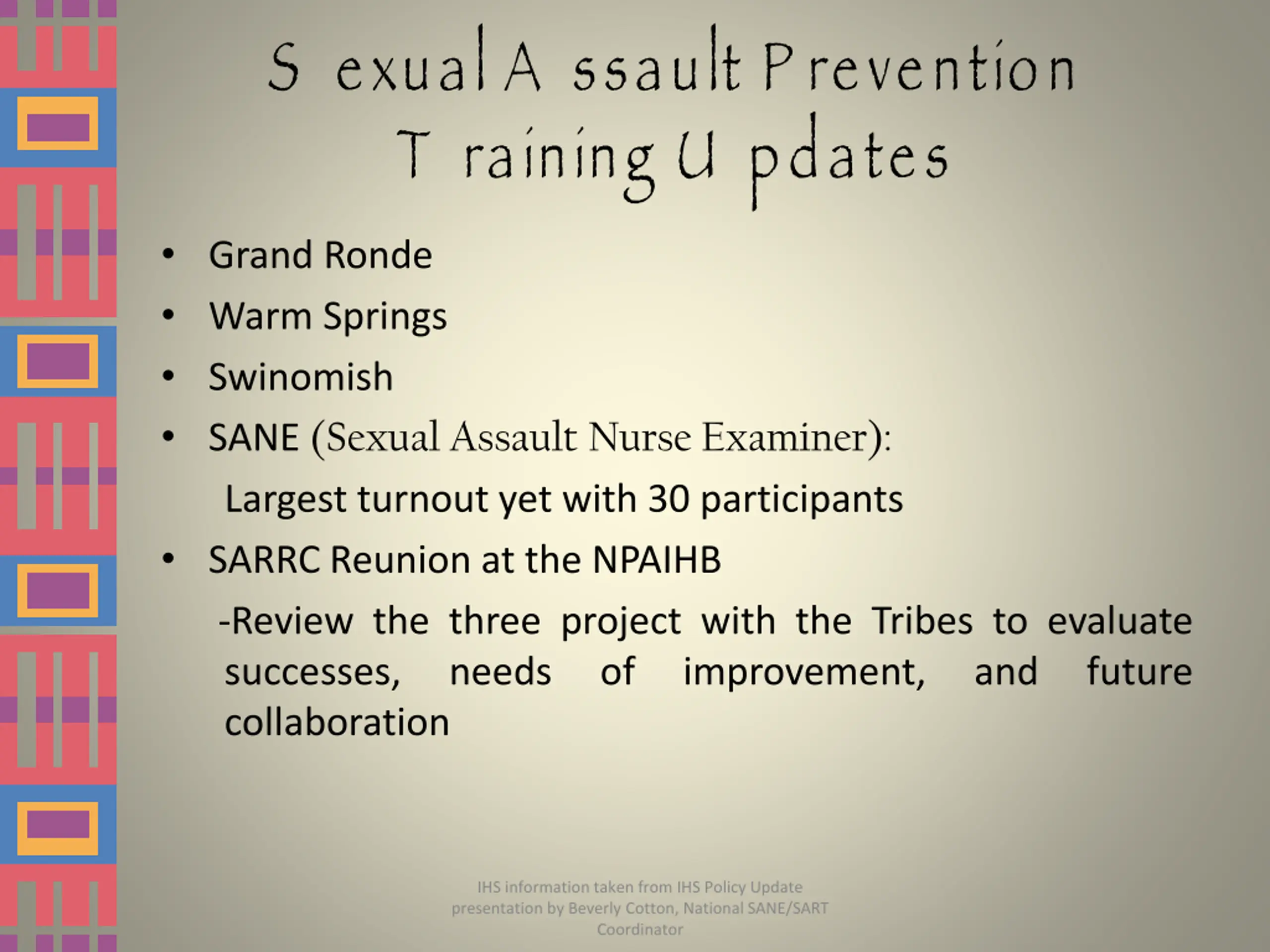 S exual A ssault P revention T raining U pdates Grand Ronde Warm Springs Swinomish SANE (Sexual Assault Nurse Examiner): Largest turnout yet with 30 participants SARRC Reunion at the NPAIHB -Review the three project with the Tribes to evaluate successes, needs of improvement, and future collaboration IHS information taken from IHS Policy Update presentation by Beverly Cotton, National SANE/SART Coordinator