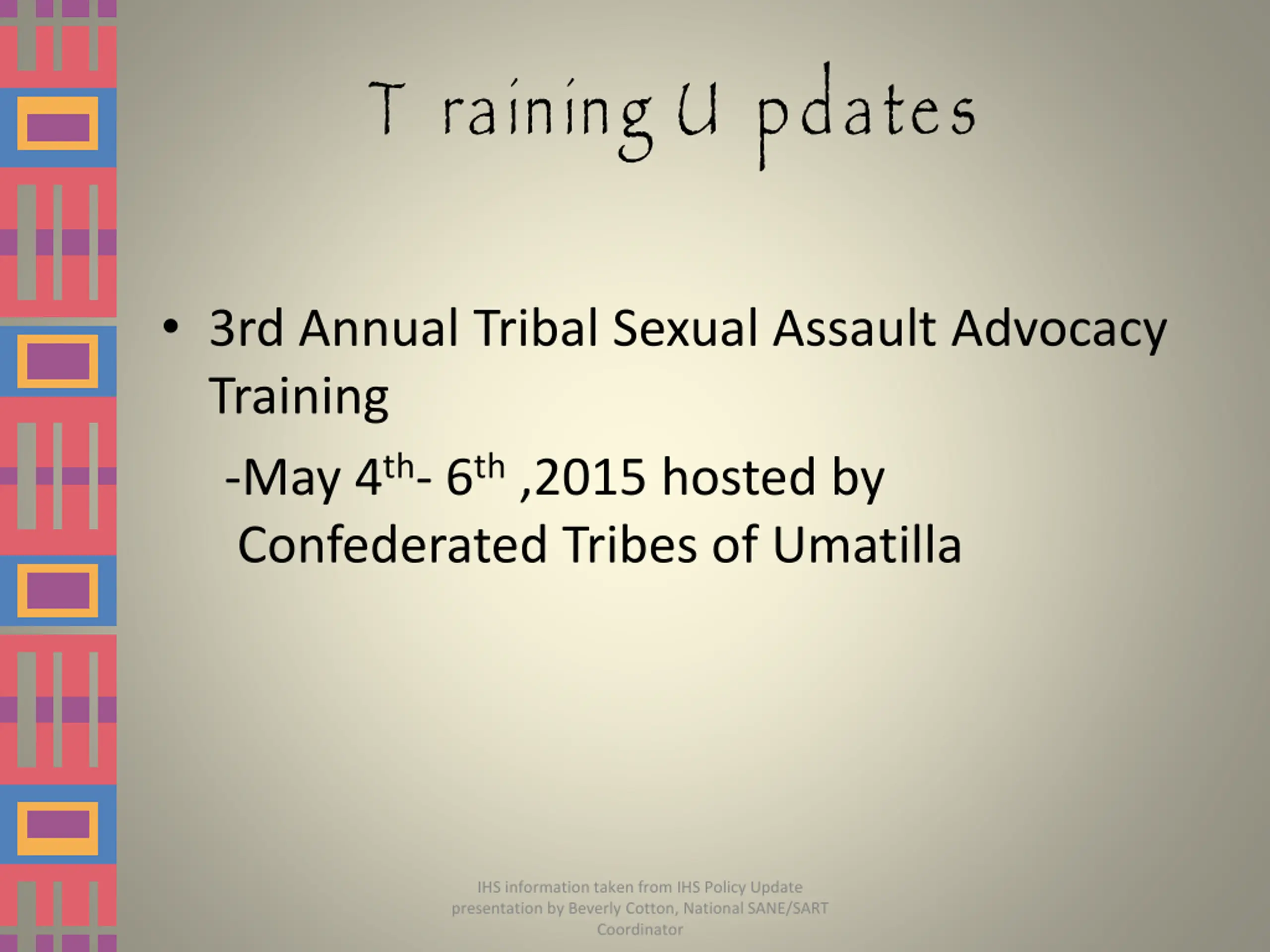 T raining U pdates 3rd Annual Tribal Sexual Assault Advocacy Training -May 4th- 6th ,2015 hosted by Confederated Tribes of Umatilla IHS information taken from IHS Policy Update presentation by Beverly Cotton, National SANE/SART Coordinator
