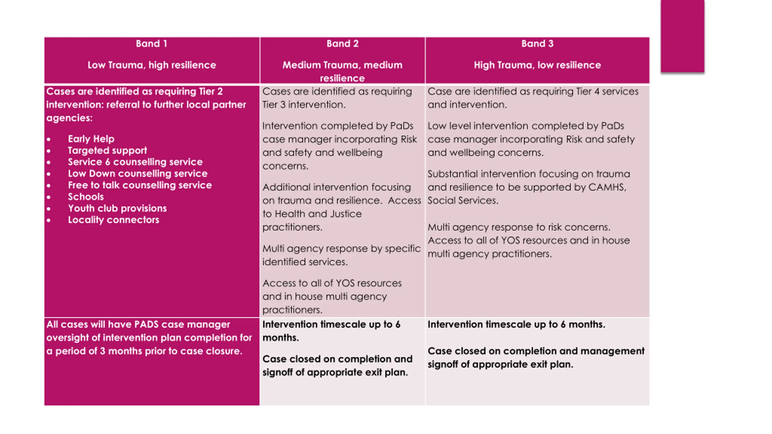 Band 1 Band 2 Band 3 Low Trauma, high resilience Medium Trauma, medium resilience Cases are identified as requiring Tier 3 intervention. High Trauma, low resilience Cases are identified as requiring Tier 2 intervention: referral to further local partner agencies: Case are identified as requiring Tier 4 services and intervention. Intervention completed by PaDs case manager incorporating Risk and safety and wellbeing concerns. Low level intervention completed by PaDs case manager incorporating Risk and safety and wellbeing concerns. Early Help Targeted support Service 6 counselling service Low Down counselling service Free to talk counselling service Schools Youth club provisions Locality connectors Substantial intervention focusing on trauma and resilience to be supported by CAMHS, Social Services. Additional intervention focusing on trauma and resilience. Access to Health and Justice practitioners. Multi agency response to risk concerns. Access to all of YOS resources and in house multi agency practitioners. Multi agency response by specific identified services. Access to all of YOS resources and in house multi agency practitioners. Intervention timescale up to 6 months. All cases will have PADS case manager oversight of intervention plan completion for a period of 3 months prior to case closure. Intervention timescale up to 6 months. Case closed on completion and management signoff of appropriate exit plan. Case closed on completion and signoff of appropriate exit plan.