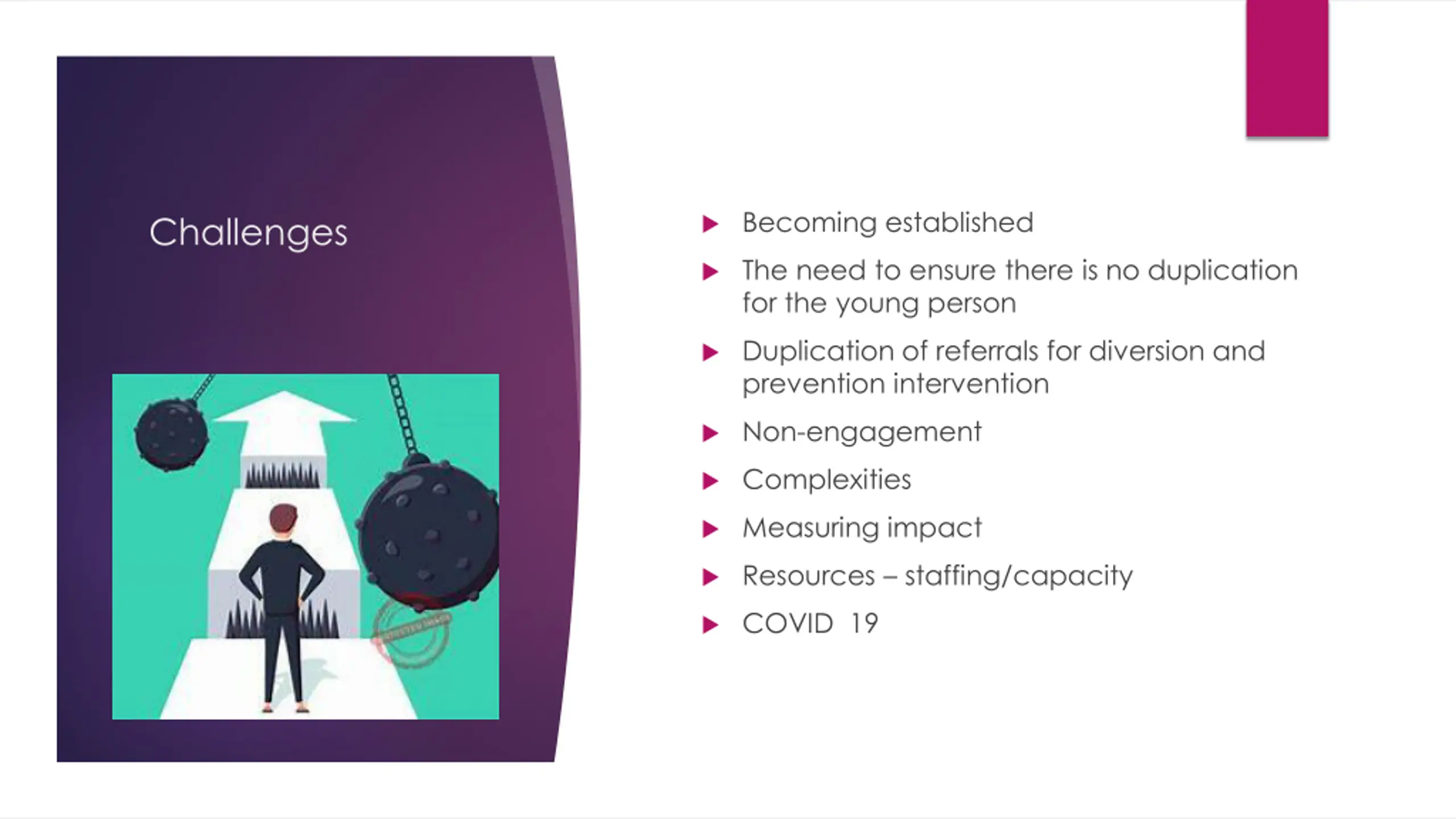 Becoming established Challenges The need to ensure there is no duplication for the young person Duplication of referrals for diversion and prevention intervention Non-engagement Complexities Measuring impact Resources staffing/capacity COVID 19