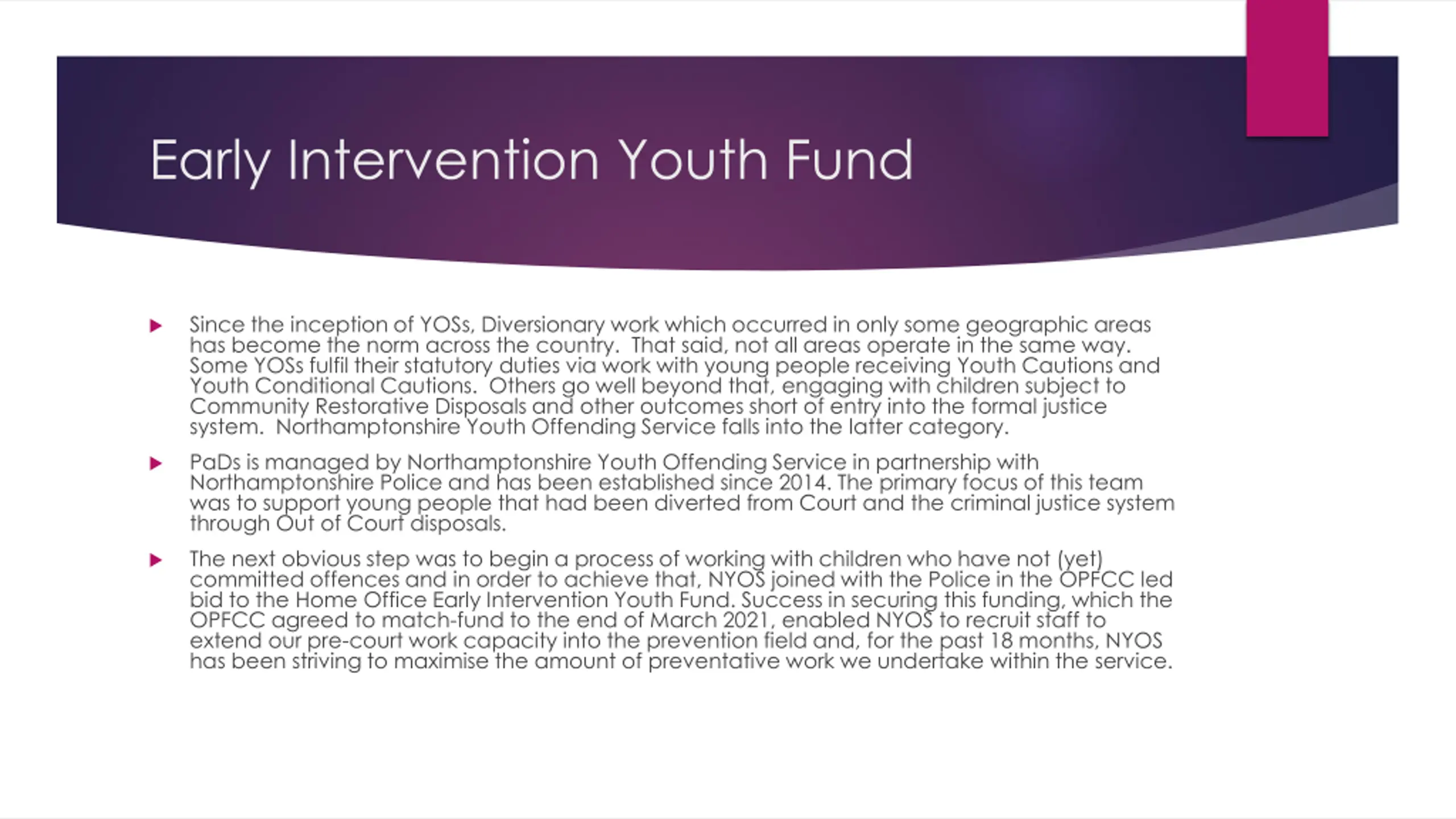 Early Intervention Youth Fund Since the inception of YOSs, Diversionary work which occurred in only some geographic areas has become the norm across the country. That said, not all areas operate in the same way. Some YOSs fulfil their statutory duties via work with young people receiving Youth Cautions and Youth Conditional Cautions. Others go well beyond that, engaging with children subject to Community Restorative Disposals and other outcomes short of entry into the formal justice system. Northamptonshire Youth Offending Service falls into the latter category. PaDs is managed by Northamptonshire Youth Offending Service in partnership with Northamptonshire Police and has been established since 2014. The primary focus of this team was to support young people that had been diverted from Court and the criminal justice system through Out of Court disposals. The next obvious step was to begin a process of working with children who have not (yet) committed offences and in order to achieve that, NYOS joined with the Police in the OPFCC led bid to the Home Office Early Intervention Youth Fund. Success in securing this funding, which the OPFCC agreed to match-fund to the end of March 2021, enabled NYOS to recruit staff to extend our pre-court work capacity into the prevention field and, for the past 18 months, NYOS has been striving to maximise the amount of preventative work we undertake within the service.