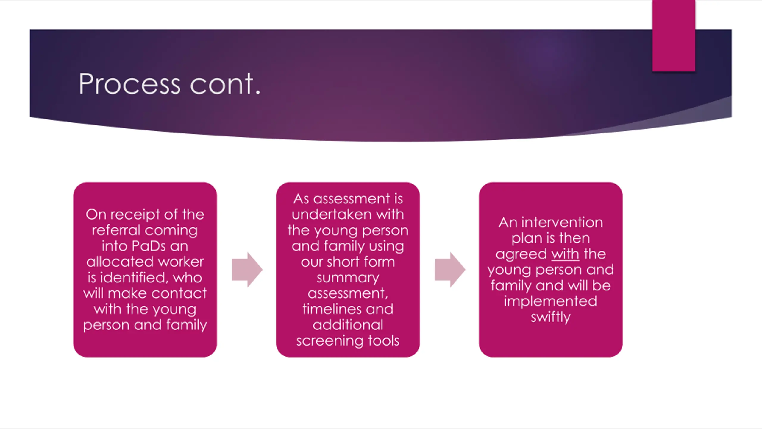Process cont. As assessment is undertaken with the young person and family using our short form summary assessment, timelines and additional screening tools On receipt of the referral coming into PaDs an allocated worker is identified, who will make contact with the young person and family An intervention plan is then agreed with the young person and family and will be implemented swiftly