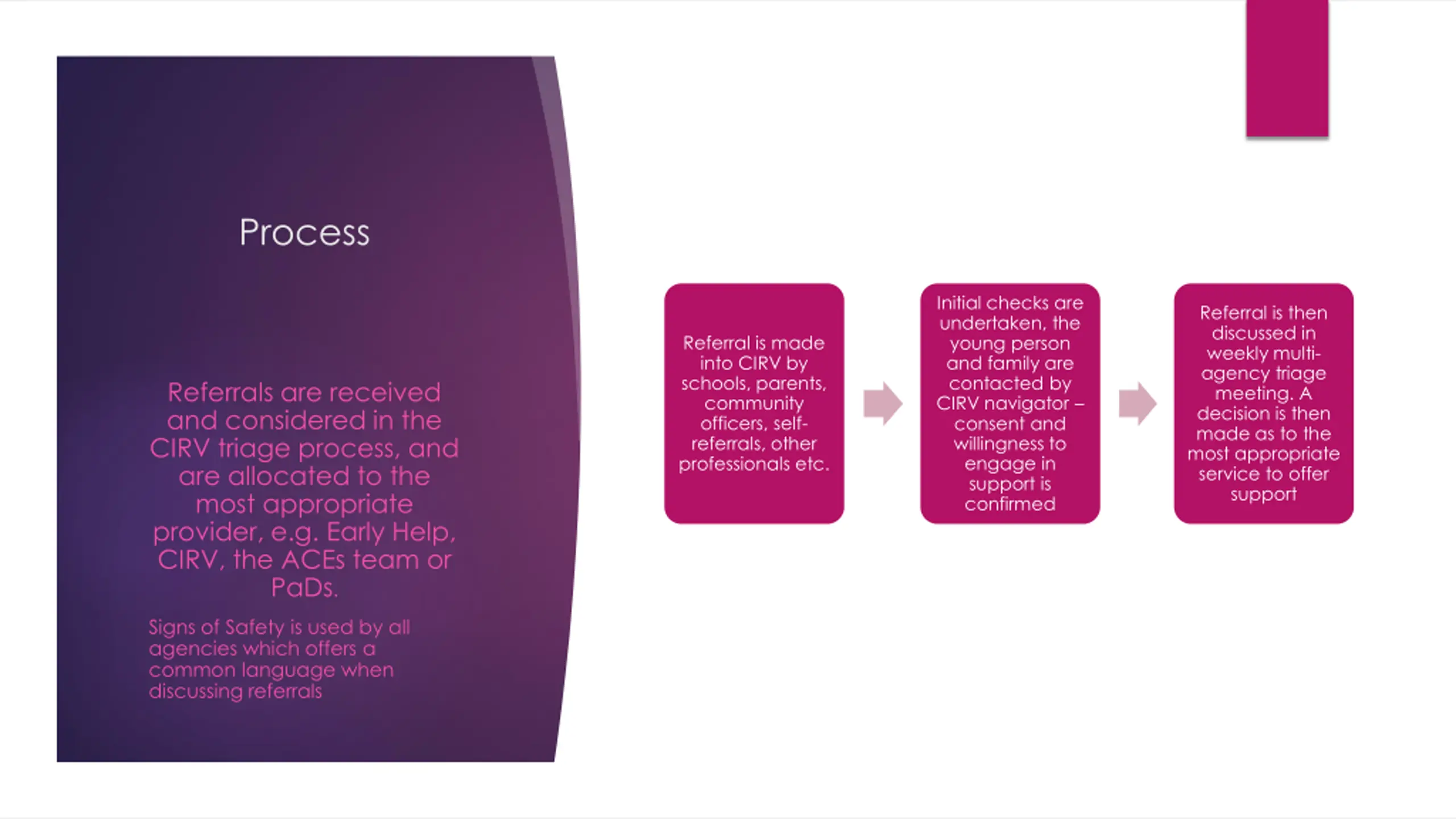 Process Initial checks are undertaken, the young person and family are contacted by CIRV navigator consent and willingness to engage in support is confirmed Referral is then discussed in weekly multi- agency triage meeting. A decision is then made as to the most appropriate service to offer support Referral is made into CIRV by schools, parents, community officers, self- referrals, other professionals etc. Referrals are received and considered in the CIRV triage process, and are allocated to the most appropriate provider, e.g. Early Help, CIRV, the ACEs team or PaDs. Signs of Safety is used by all agencies which offers a common language when discussing referrals