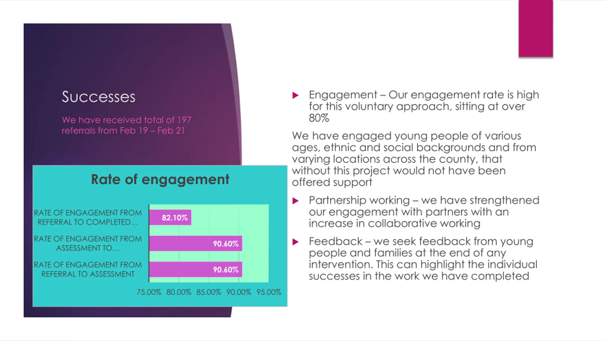 Successes Engagement Our engagement rate is high for this voluntary approach, sitting at over 80% We have engaged young people of various ages, ethnic and social backgrounds and from varying locations across the county, that without this project would not have been offered support We have received total of 197 referrals from Feb 19 Feb 21 Rate of engagement Partnership working we have strengthened our engagement with partners with an increase in collaborative working RATE OF ENGAGEMENT FROM REFERRAL TO COMPLETED 82.10% RATE OF ENGAGEMENT FROM ASSESSMENT TO Feedback we seek feedback from young people and families at the end of any intervention. This can highlight the individual successes in the work we have completed 90.60% RATE OF ENGAGEMENT FROM REFERRAL TO ASSESSMENT 90.60% 75.00% 80.00% 85.00% 90.00% 95.00%