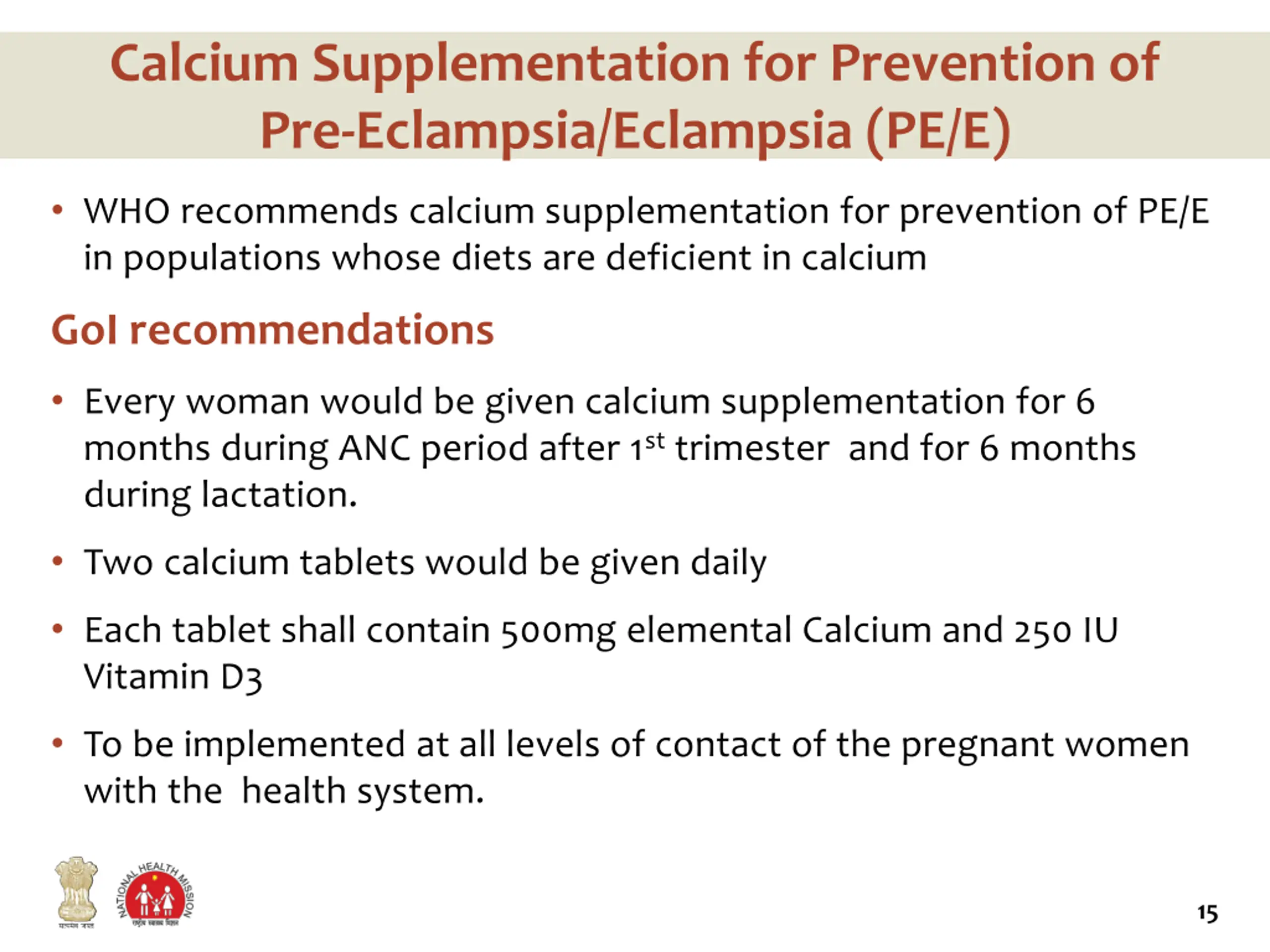 Calcium Supplementation for Prevention of Pre-Eclampsia/Eclampsia (PE/E) WHO recommends calcium supplementation for prevention of PE/E in populations whose diets are deficient in calcium GoI recommendations Every woman would be given calcium supplementation for 6 months during ANC period after 1st trimester and for 6 months during lactation. Two calcium tablets would be given daily Each tablet shall contain 500mg elemental Calcium and 250 IU Vitamin D3 To be implemented at all levels of contact of the pregnant women with the health system. 15