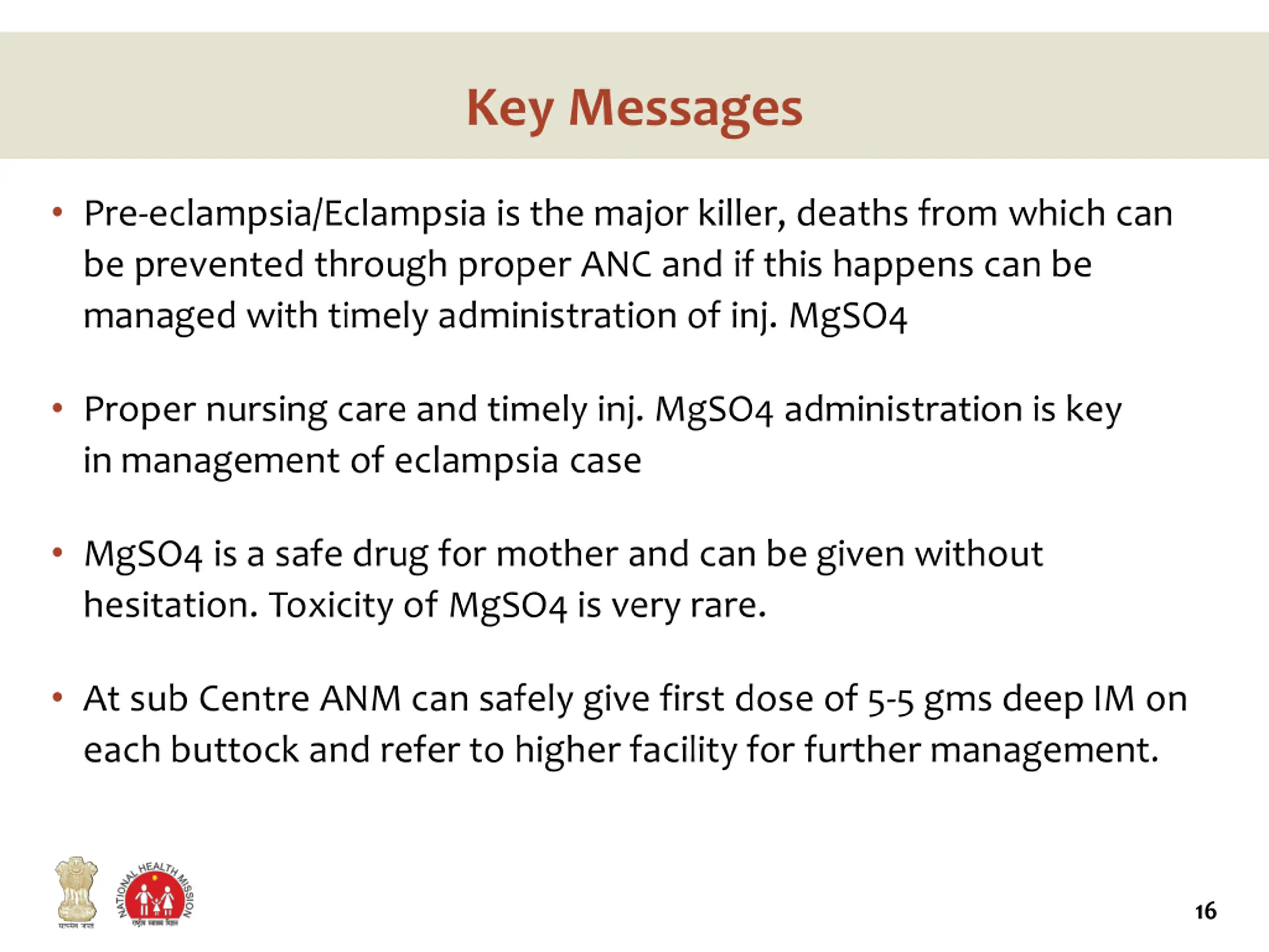 Key Messages Pre-eclampsia/Eclampsia is the major killer, deaths from which can be prevented through proper ANC and if this happens can be managed with timely administration of inj. MgSO4 Proper nursing care and timely inj. MgSO4 administration is key in management of eclampsia case MgSO4 is a safe drug for mother and can be given without hesitation. Toxicity of MgSO4 is very rare. At sub Centre ANM can safely give first dose of 5-5 gms deep IM on each buttock and refer to higher facility for further management. 16