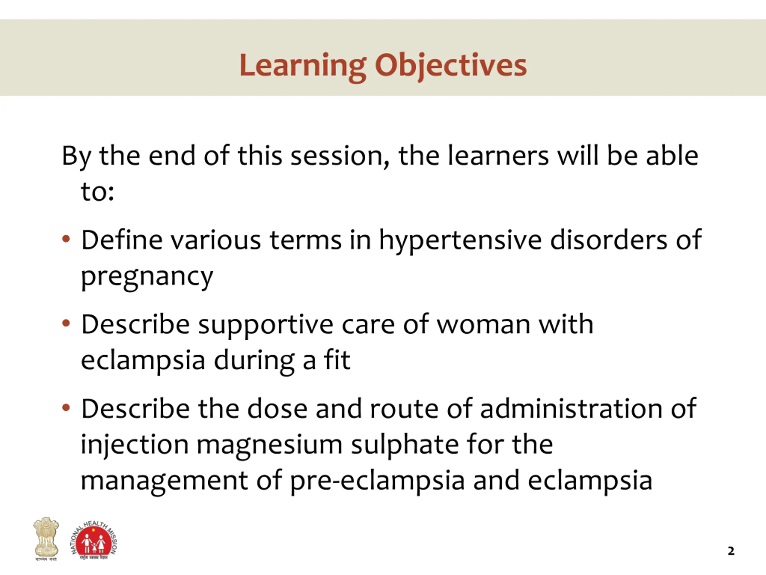 Learning Objectives By the end of this session, the learners will be able to: Define various terms in hypertensive disorders of pregnancy Describe supportive care of woman with eclampsia during a fit Describe the dose and route of administration of injection magnesium sulphate for the management of pre-eclampsia and eclampsia 2