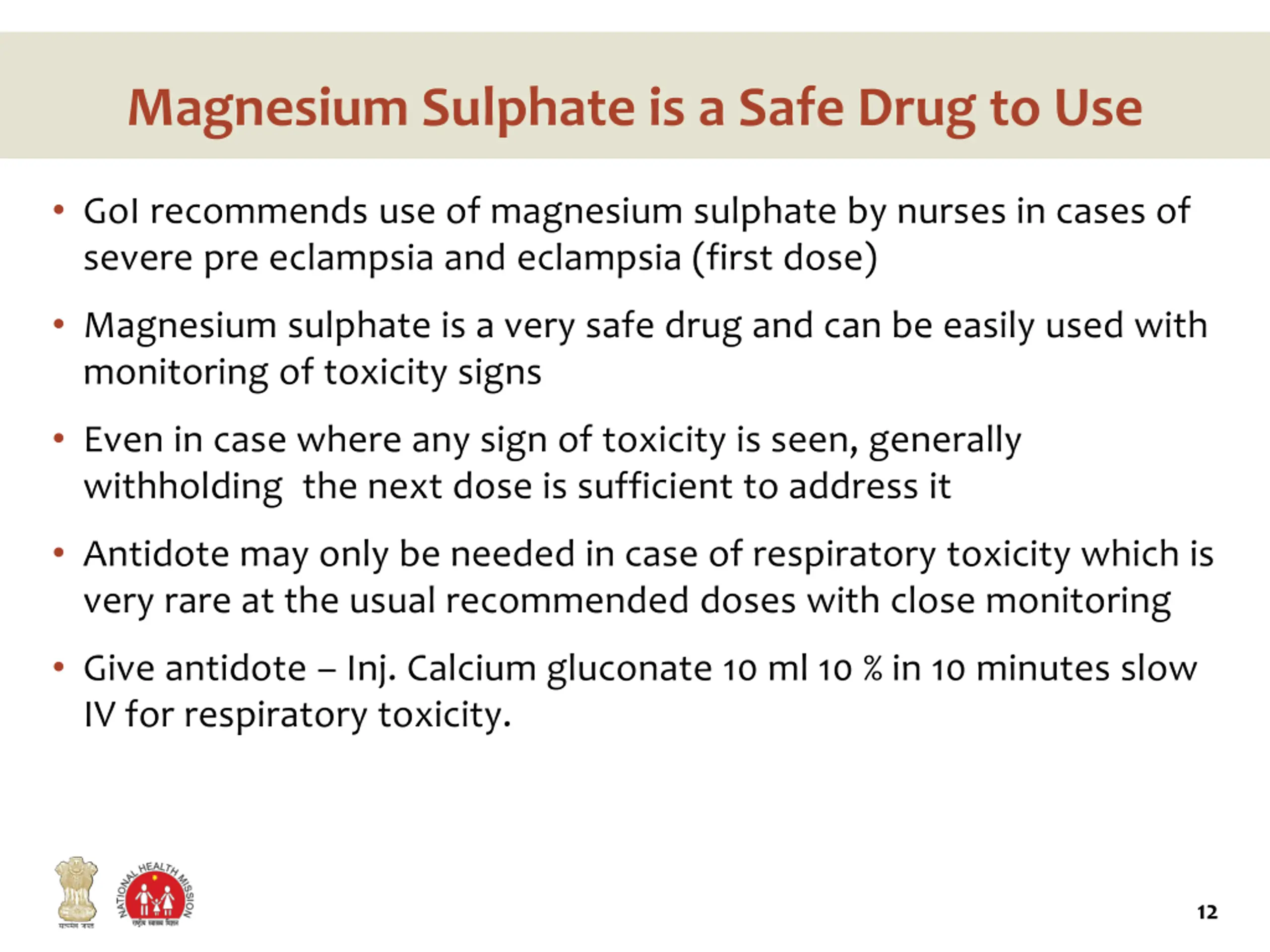 Magnesium Sulphate is a Safe Drug to Use GoI recommends use of magnesium sulphate by nurses in cases of severe pre eclampsia and eclampsia (first dose) Magnesium sulphate is a very safe drug and can be easily used with monitoring of toxicity signs Even in case where any sign of toxicity is seen, generally withholding the next dose is sufficient to address it Antidote may only be needed in case of respiratory toxicity which is very rare at the usual recommended doses with close monitoring Give antidote Inj. Calcium gluconate 10 ml 10 % in 10 minutes slow IV for respiratory toxicity. 12